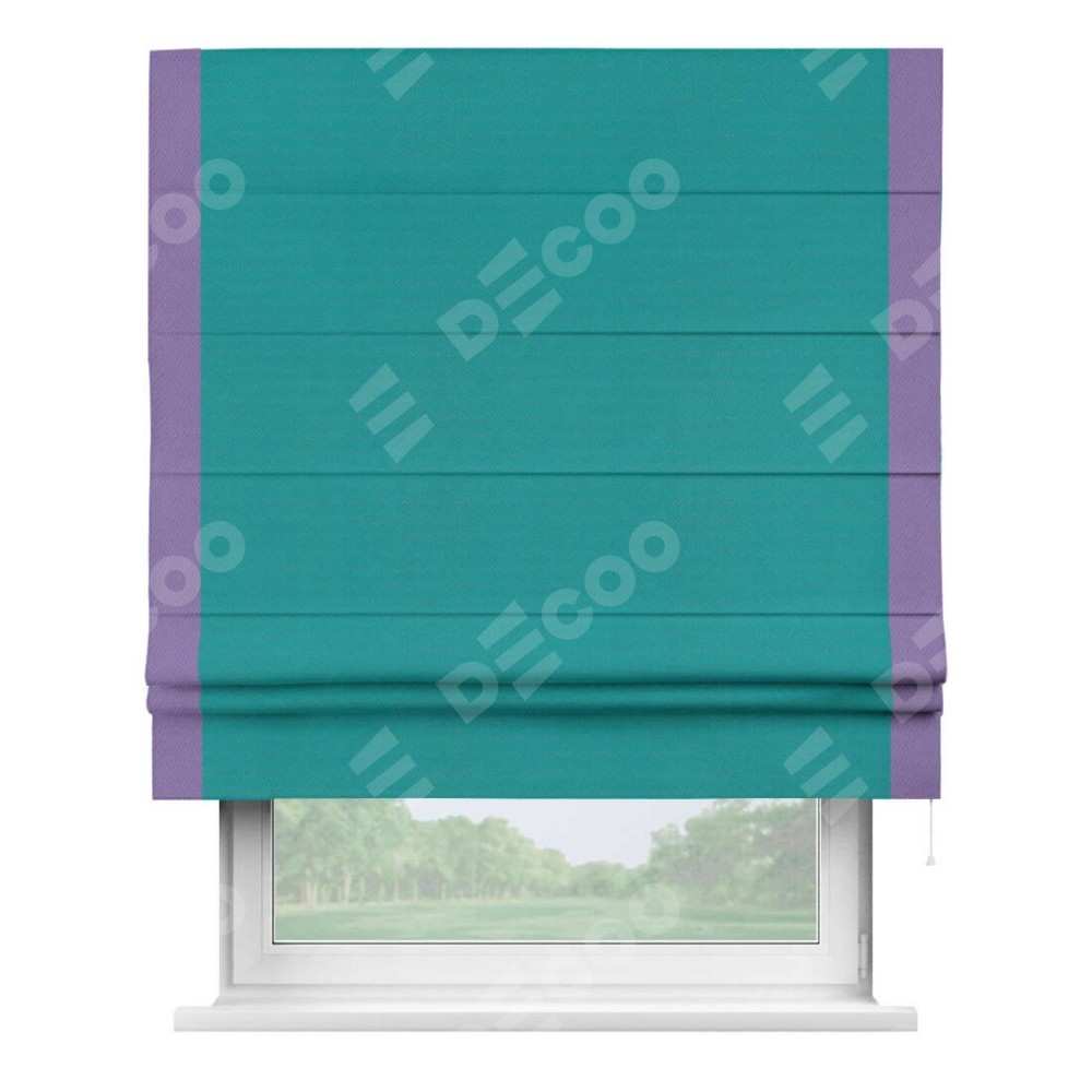 Римская штора производителя «Cortin», используется для проёма, пошита из ткани блэкаут однотонный бирюзовый, артикул ткани 88297. Отделка шторы кантом «Стрим Дуо», ткань для канта используется из блэкаута однотонного разной расцветки на выбор. Имеет универсальный механизм и подходит для монтажа: на потолок, на стену и в нишу.