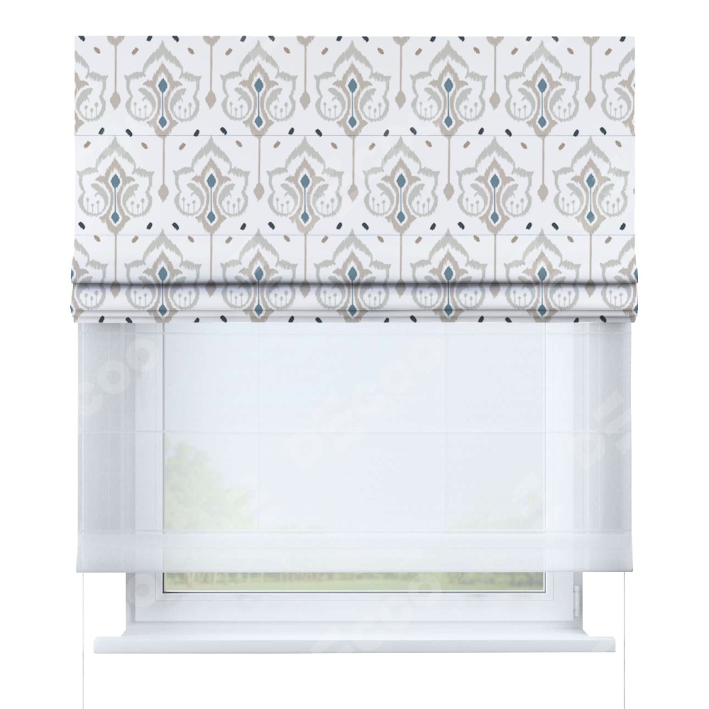 Римская штора день-ночь производителя «Cortin», используется для проёма, пошита из двух полотен, с лицевой блэкаут с нанесением сублимационной печати «Икат узор», вторая ткань тюль (по стандарту комплектуется тюль белого цвета артикул V-01). Имеет универсальный механизм и подходит для монтажа: на потолок, на стену и в нишу.