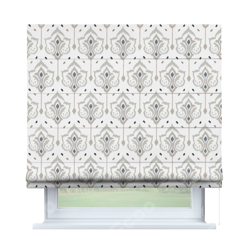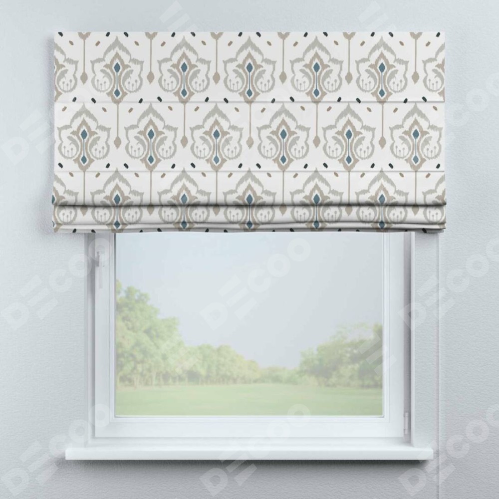 Римская штора «Кортин» для проема «Икат узор» отлично подойдёт для интерьера: в спальню, на балкон и в гостиную.