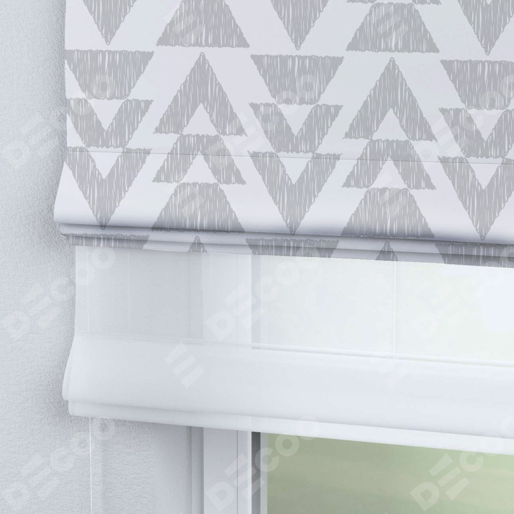 Римская штора день-ночь производителя «Cortin», используется для проёма, пошита из двух полотен, с лицевой блэкаут с нанесением сублимационной печати «Серые стрелки», вторая ткань тюль (по стандарту комплектуется тюль белого цвета артикул V-01). Имеет универсальный механизм и подходит для монтажа: на потолок, на стену и в нишу.