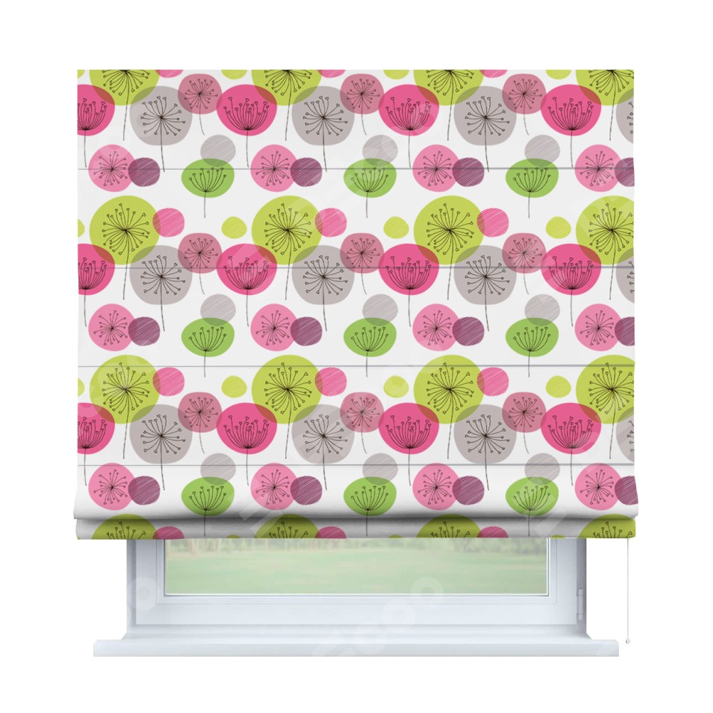 Римская штора производителя «Cortin», используется для проёма, пошита из ткани блэкаут с нанесением сублимационной печати «Цветные одуванчики». Имеет универсальный механизм и подходит для монтажа: на потолок, на стену и в нишу.