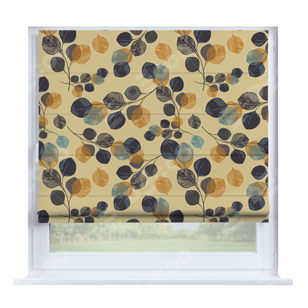 Римская штора производителя «Cortin», устанавливается на створку окна, пошита из ткани блэкаут с нанесением сублимационной печати «Листья в янтаре». Штора шьётся по индивидуальным размерам, для данного типа римской шторы возможная ширина от 35 до 150 см., высота до 250 см.