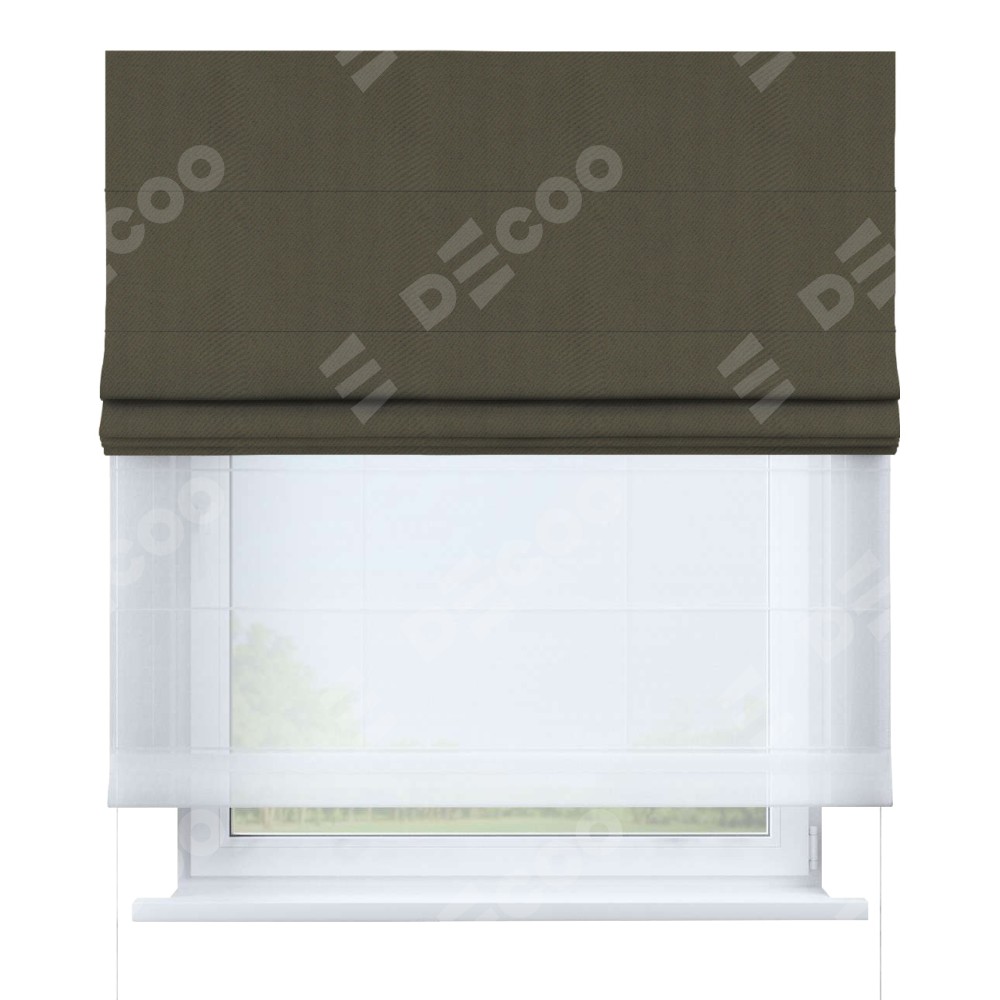 Римская штора день-ночь производителя «Cortin», используется для проёма, пошита из двух полотен, с лицевой стороны блэкаут однотонный кофейный артикул 6668−22, вторая ткань тюль (по стандарту комплектуется тюль белого цвета артикул V-01). Имеет универсальный механизм и подходит для монтажа: на потолок, на стену и в нишу.