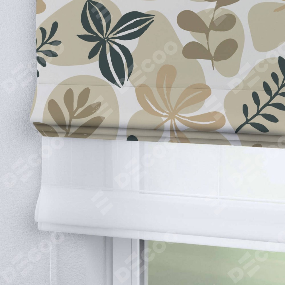 Римская штора день-ночь производителя «Cortin», используется для проёма, пошита из двух полотен, с лицевой блэкаут с нанесением сублимационной печати «Бежевый сад», вторая ткань тюль (по стандарту комплектуется тюль белого цвета артикул V-01). Имеет универсальный механизм и подходит для монтажа: на потолок, на стену и в нишу.