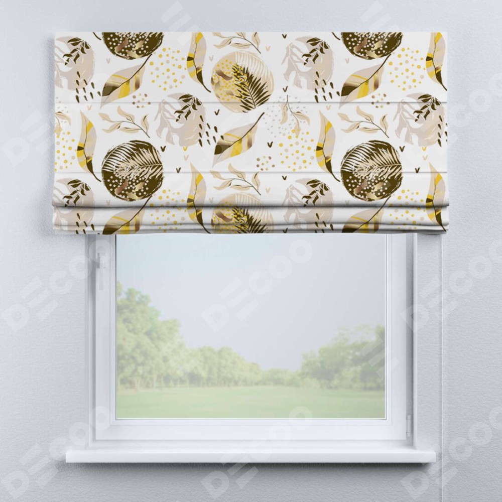 Римская штора «Кортин» для проема «Золотые листья» отлично подойдёт для интерьера: в кухню, в гостиную и в спальню.