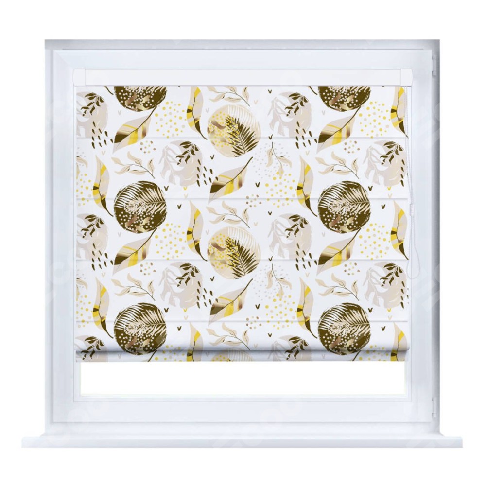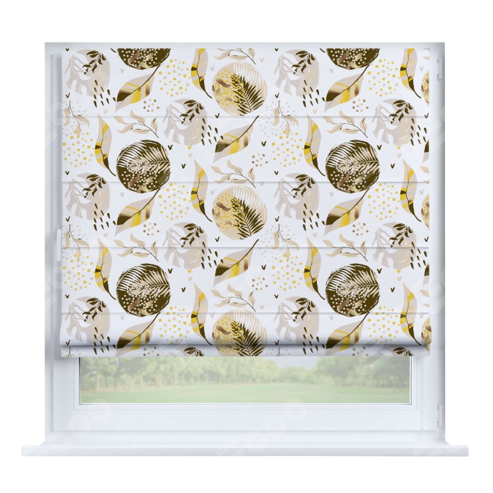 Римская штора производителя «Cortin», устанавливается на створку окна, пошита из ткани блэкаут с нанесением сублимационной печати «Золотые листья». Штора шьётся по индивидуальным размерам, для данного типа римской шторы возможная ширина от 35 до 150 см., высота до 250 см.