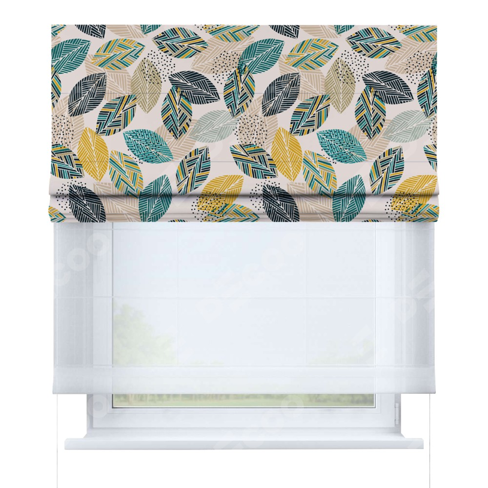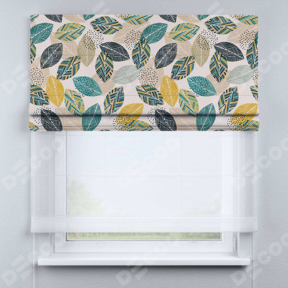 Римская штора день-ночь производителя «Cortin», используется для проёма, пошита из двух полотен, с лицевой блэкаут с нанесением сублимационной печати «Листья с орнаментом», вторая ткань тюль (по стандарту комплектуется тюль белого цвета артикул V-01). Имеет универсальный механизм и подходит для монтажа: на потолок, на стену и в нишу.