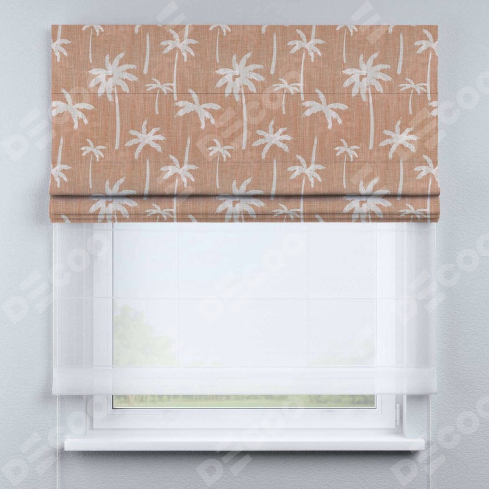 Римская штора день-ночь производителя «Cortin», используется для проёма, пошита из двух полотен, с лицевой блэкаут с нанесением сублимационной печати «Пальмы на закате», вторая ткань тюль (по стандарту комплектуется тюль белого цвета артикул V-01). Имеет универсальный механизм и подходит для монтажа: на потолок, на стену и в нишу.