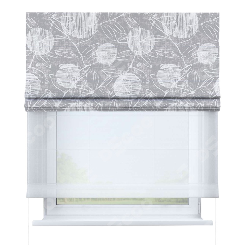Римская штора день-ночь производителя «Cortin», используется для проёма, пошита из двух полотен, с лицевой блэкаут с нанесением сублимационной печати «Серо-белая фантазия», вторая ткань тюль (по стандарту комплектуется тюль белого цвета артикул V-01). Имеет универсальный механизм и подходит для монтажа: на потолок, на стену и в нишу.