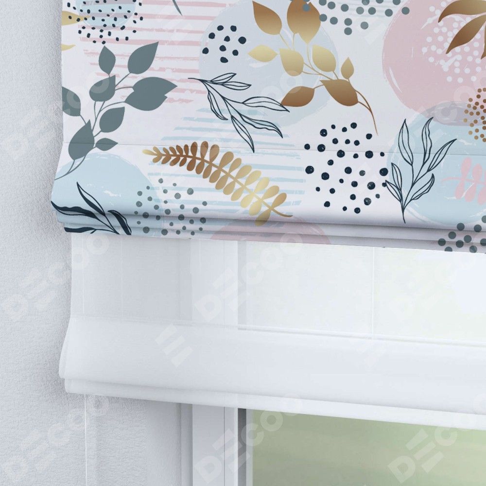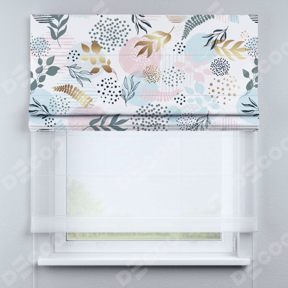 Римская штора день-ночь производителя «Cortin», используется для проёма, пошита из двух полотен, с лицевой блэкаут с нанесением сублимационной печати «Точки и листочки», вторая ткань тюль (по стандарту комплектуется тюль белого цвета артикул V-01). Имеет универсальный механизм и подходит для монтажа: на потолок, на стену и в нишу.