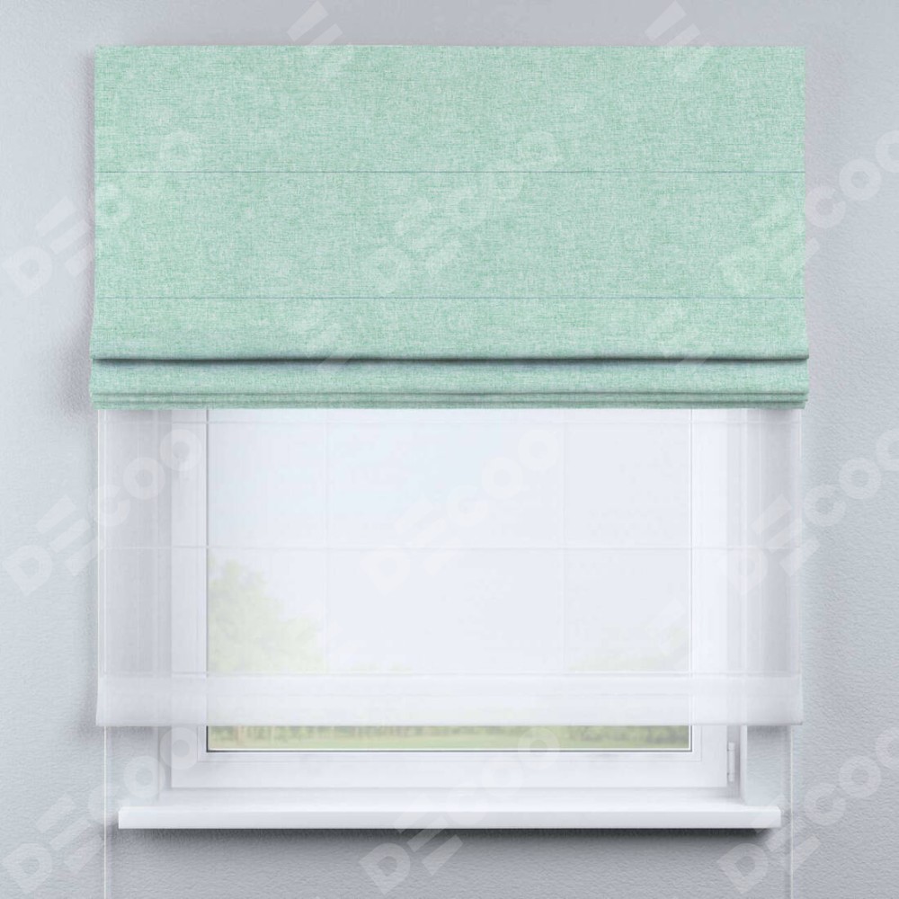 Римская штора день-ночь производителя «Cortin», используется для проёма, пошита из двух полотен, с лицевой стороны лён кашемир мятный артикул 21617, вторая ткань тюль (по стандарту комплектуется тюль белого цвета артикул V-01). Имеет универсальный механизм и подходит для монтажа: на потолок, на стену и в нишу.