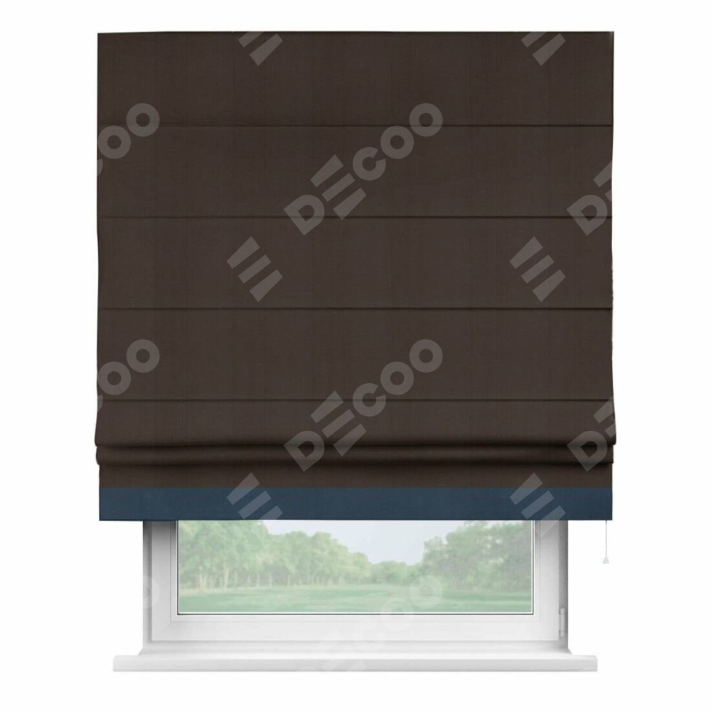 Римская штора производителя «Cortin», используется для проёма, пошита из ткани блэкаут однотонный тёмно-коричневый, артикул ткани 88287. Отделка шторы кантом «Джестер», ткань для канта используется из блэкаута однотонного разной расцветки на выбор. Имеет универсальный механизм и подходит для монтажа: на потолок, на стену и в нишу.