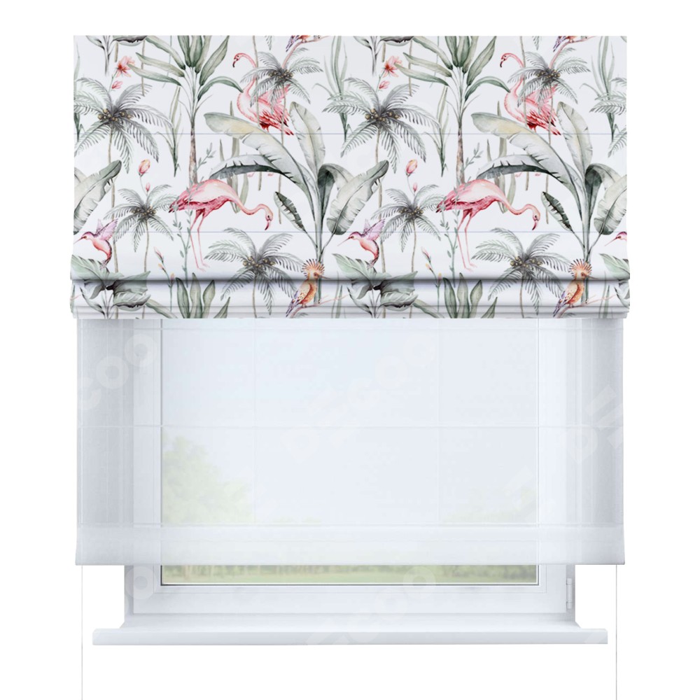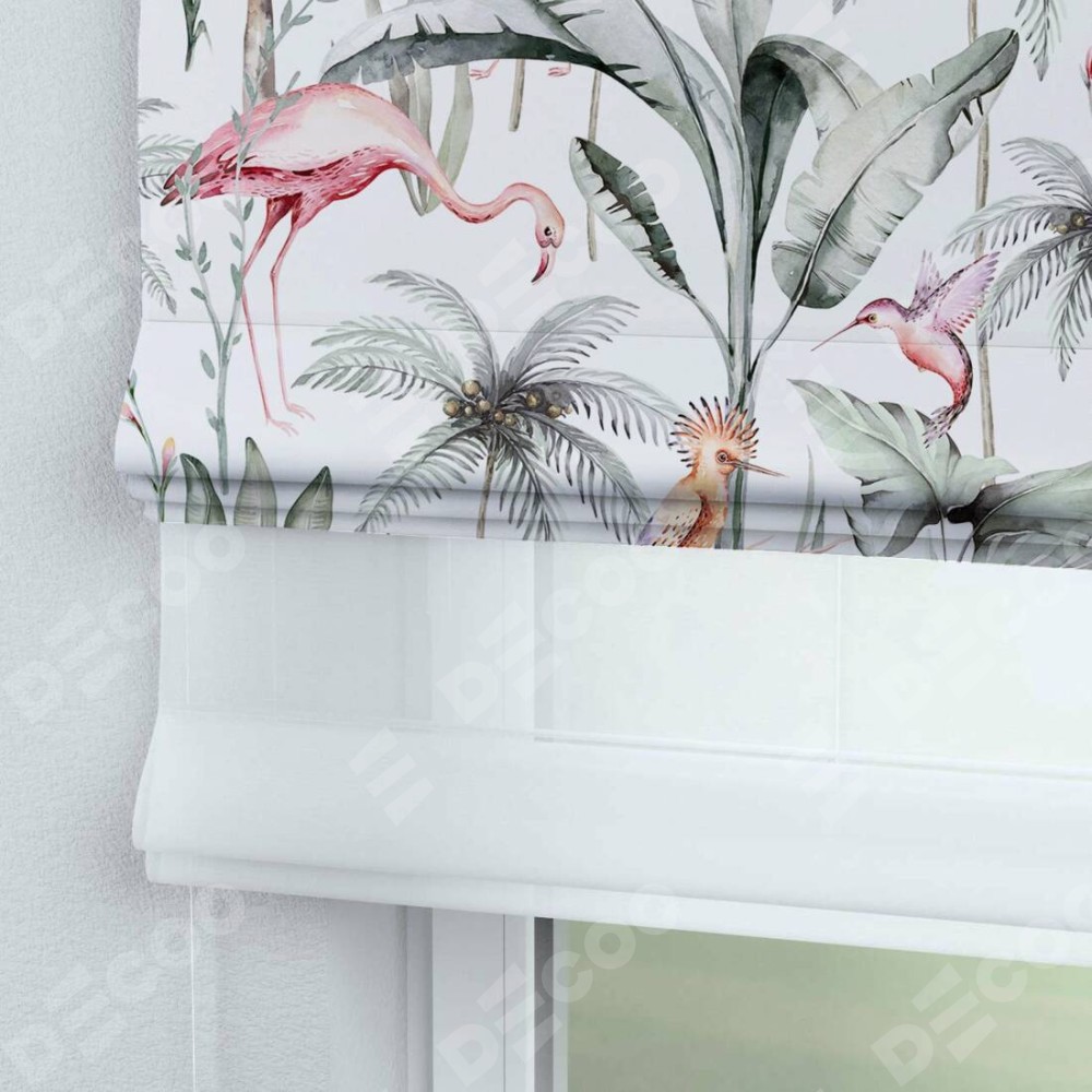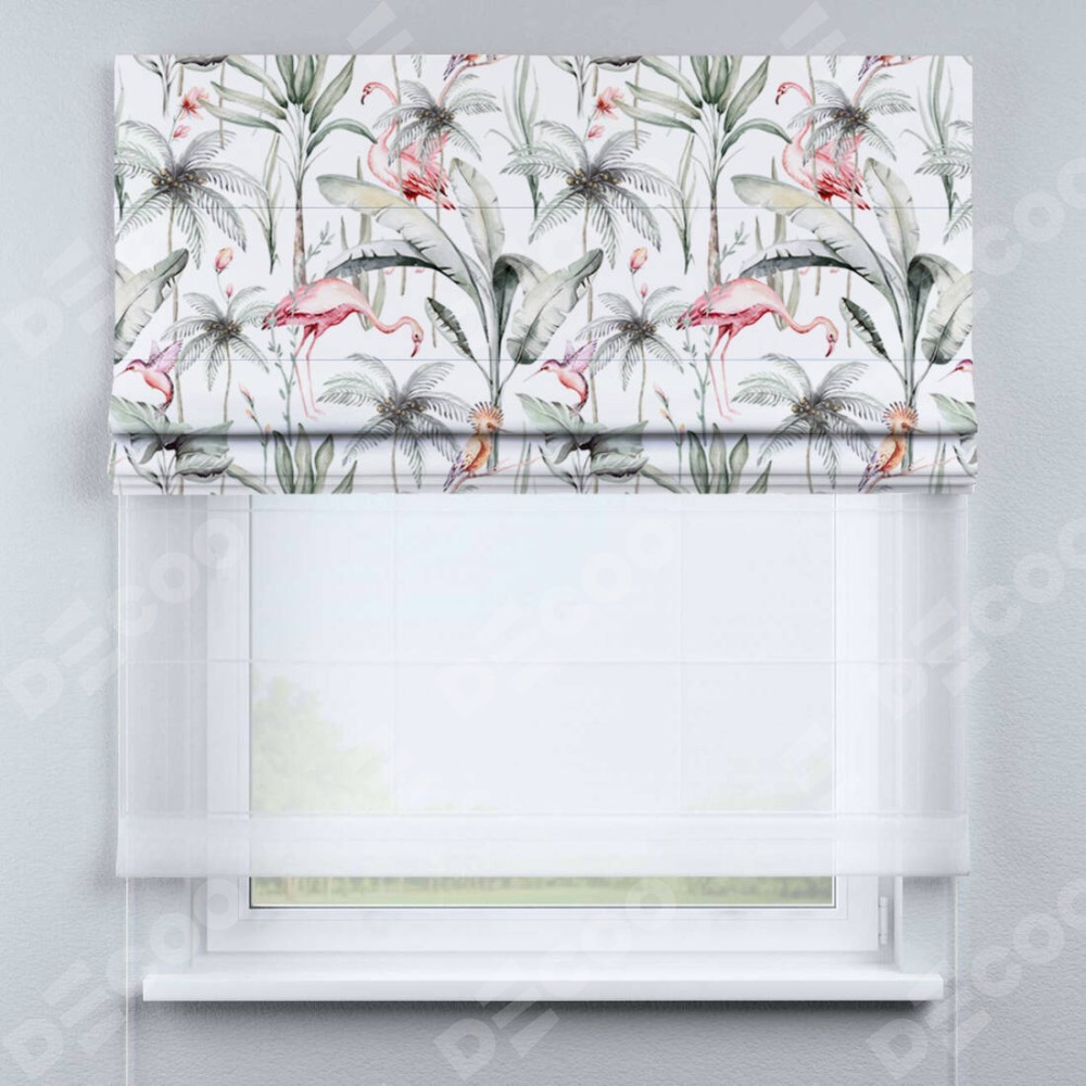 Римская штора день-ночь производителя «Cortin», используется для проёма, пошита из двух полотен, с лицевой блэкаут с нанесением сублимационной печати «Изящные фламинго», вторая ткань тюль (по стандарту комплектуется тюль белого цвета артикул V-01). Имеет универсальный механизм и подходит для монтажа: на потолок, на стену и в нишу.