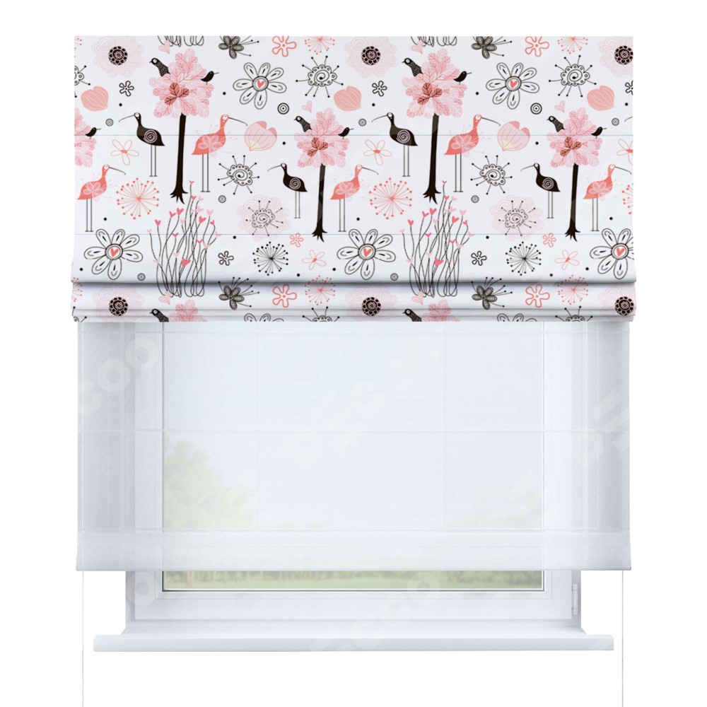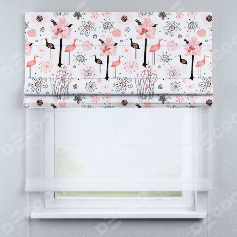 Римская штора день-ночь производителя «Cortin», используется для проёма, пошита из двух полотен, с лицевой блэкаут с нанесением сублимационной печати «Любопытные птички», вторая ткань тюль (по стандарту комплектуется тюль белого цвета артикул V-01). Имеет универсальный механизм и подходит для монтажа: на потолок, на стену и в нишу.