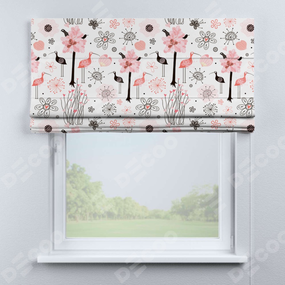 Римская штора производителя «Cortin», используется для проёма, пошита из ткани блэкаут с нанесением сублимационной печати «Любопытные птички». Имеет универсальный механизм и подходит для монтажа: на потолок, на стену и в нишу.