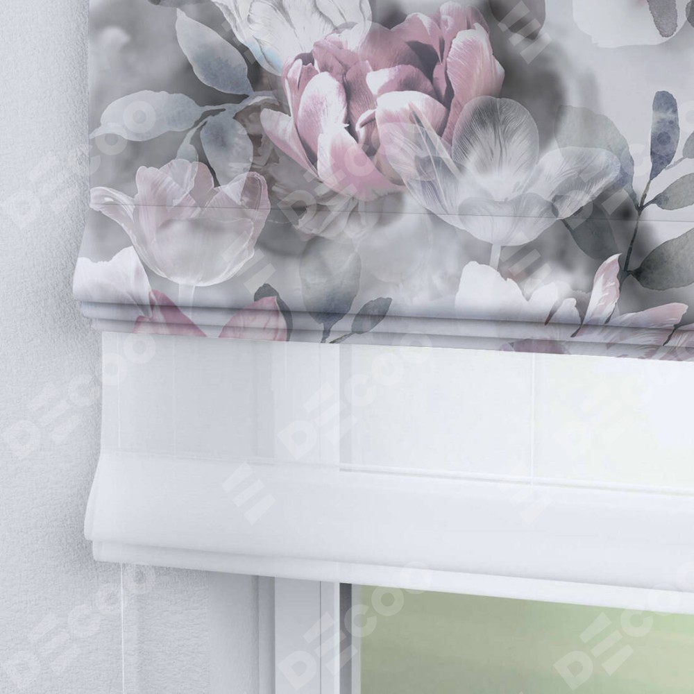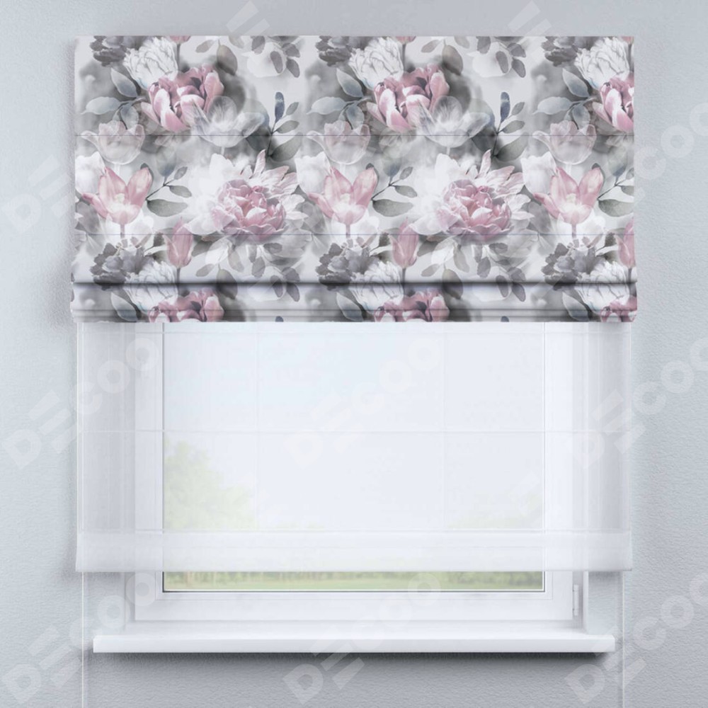 Римская штора день-ночь производителя «Cortin», используется для проёма, пошита из двух полотен, с лицевой блэкаут с нанесением сублимационной печати «Цветочная композиция», вторая ткань тюль (по стандарту комплектуется тюль белого цвета артикул V-01). Имеет универсальный механизм и подходит для монтажа: на потолок, на стену и в нишу.