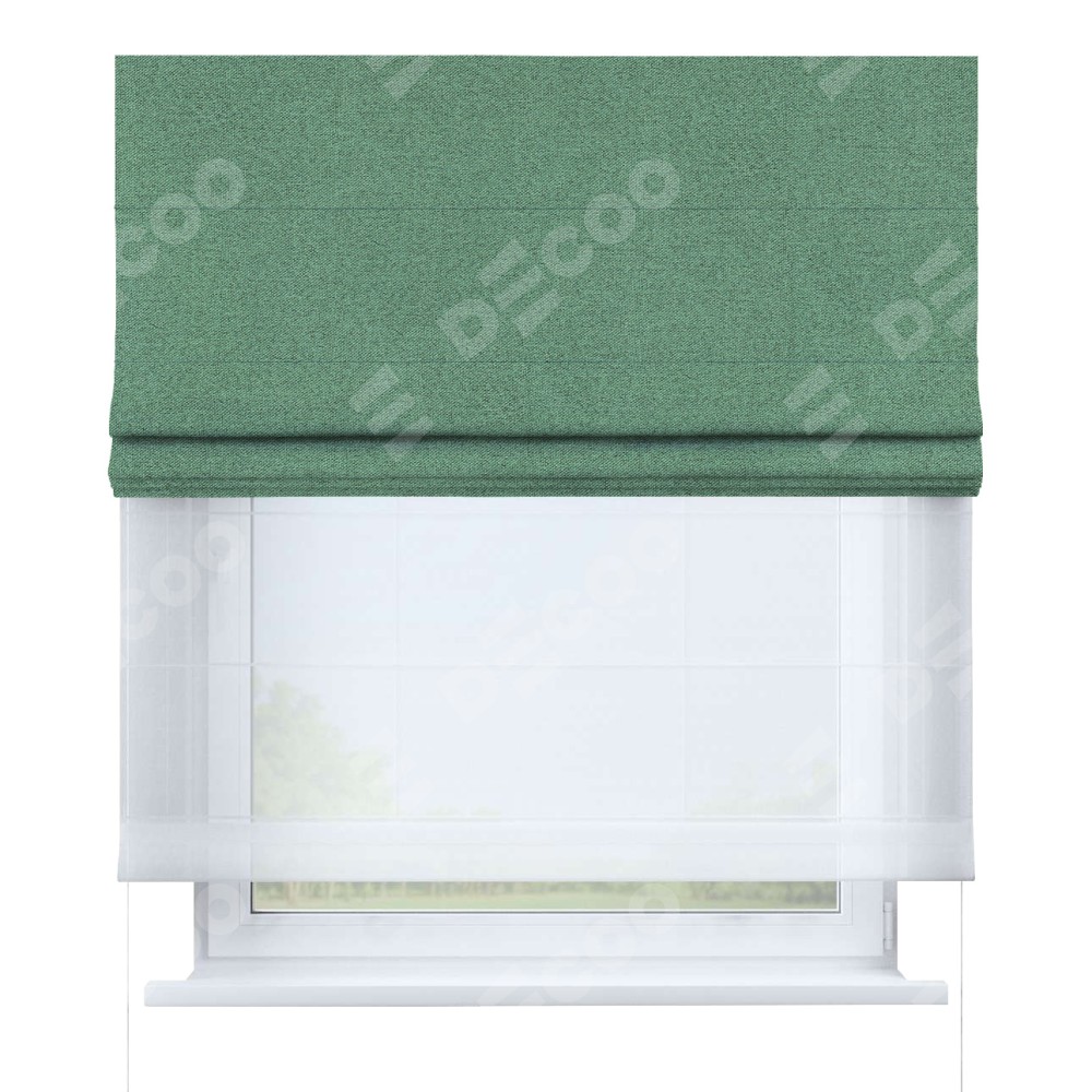 Римская штора день-ночь производителя «Cortin», используется для проёма, пошита из двух полотен, с лицевой стороны лён блэкаут светло-бирюзовый артикул 69443, вторая ткань тюль (по стандарту комплектуется тюль белого цвета артикул V-01). Имеет универсальный механизм и подходит для монтажа: на потолок, на стену и в нишу.