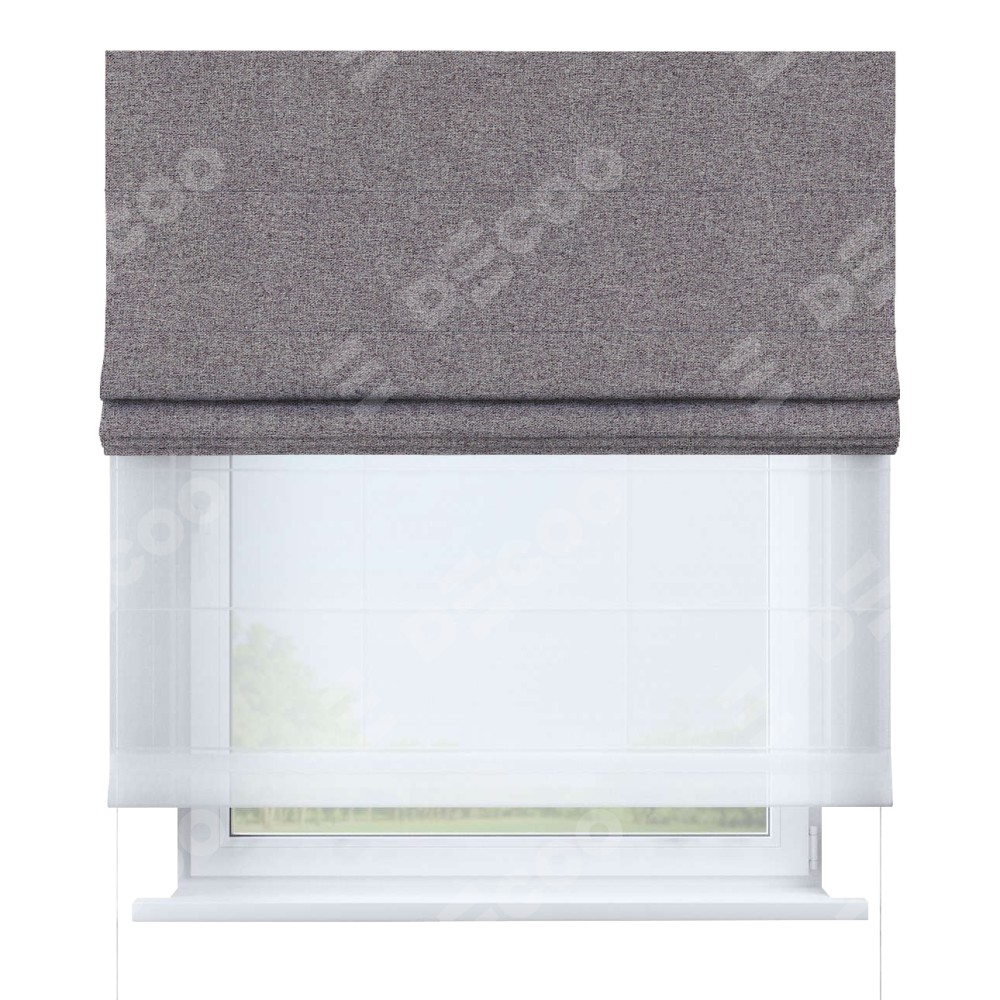 Римская штора день-ночь производителя «Cortin», используется для проёма, пошита из двух полотен, с лицевой стороны лён блэкаут сиреневый артикул 69576, вторая ткань тюль (по стандарту комплектуется тюль белого цвета артикул V-01). Имеет универсальный механизм и подходит для монтажа: на потолок, на стену и в нишу.