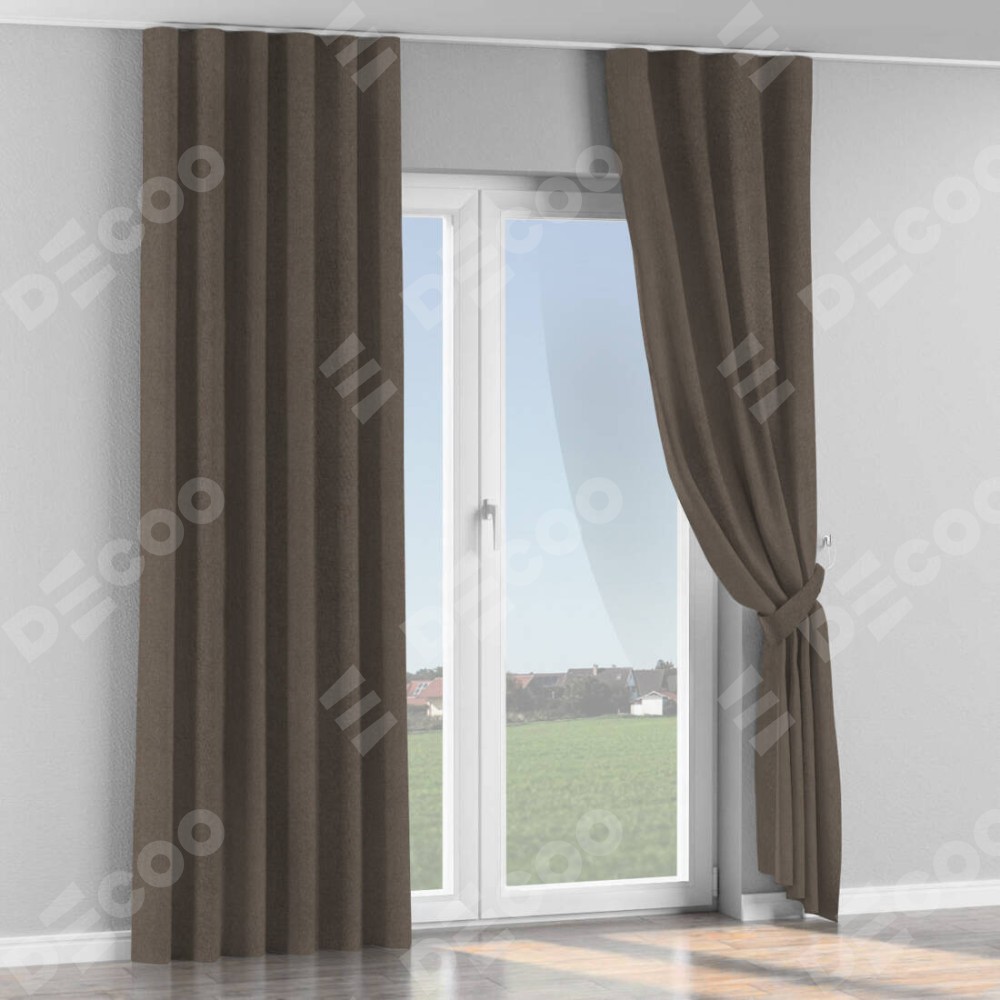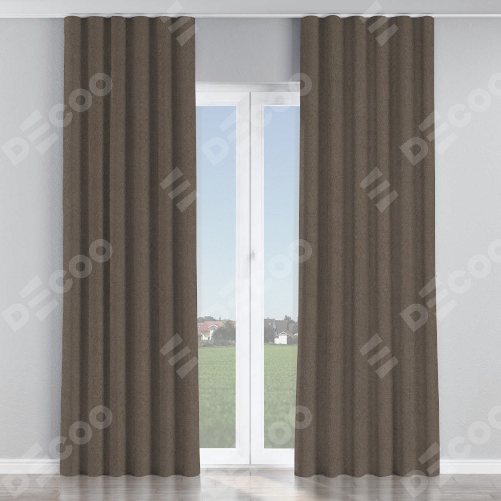 Комплект прямых штор, от производителя «Cortin», пошиты из ткани лён блэкаут коричневый, артикул ткани 69383. С изнаночной стороны в верхней части штор пристрачивается шторная лента с декоративными складками «Волна». Для создания элегантных складок прямые шторы шьются по стандарту с коэффициентом 1:2 (на 100 см. ширины проёма 200 см. ширины ткани).