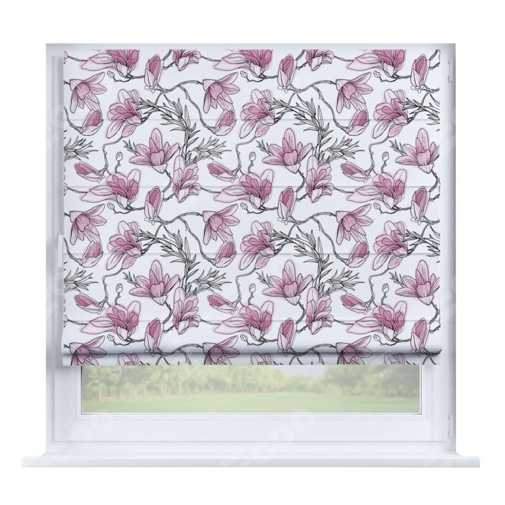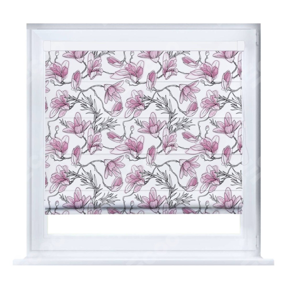 Римская штора производителя «Cortin», устанавливается на створку окна, пошита из ткани блэкаут с нанесением сублимационной печати «Цветки магнолии». Штора шьётся по индивидуальным размерам, для данного типа римской шторы возможная ширина от 35 до 150 см., высота до 250 см.