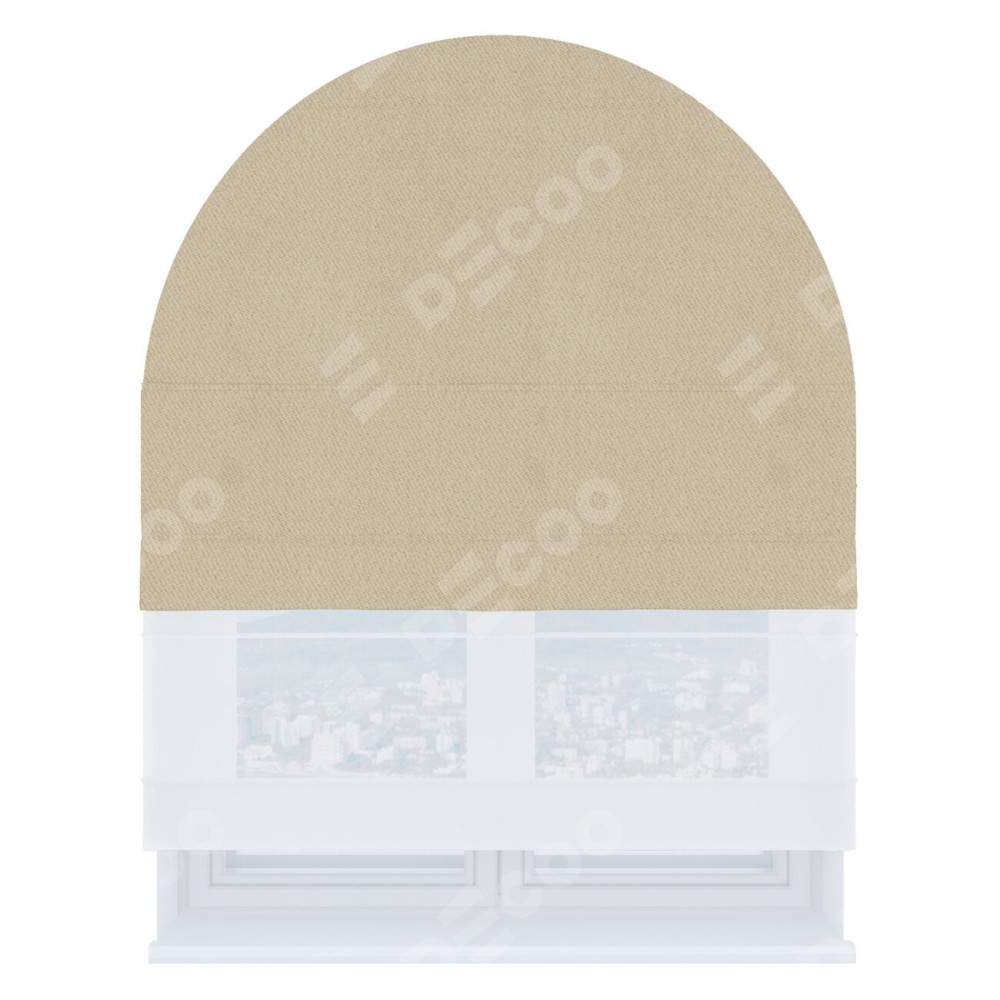 Римская штора день-ночь производителя «Cortin», используется для арочного проёма, пошита из двух полотен, с лицевой стороны блэкаут однотонный кофейно-бежевый артикул 12095−1, вторая ткань тюль (по стандарту комплектуется тюль белого цвета артикул V-01). Штора шьётся по индивидуальным размерам, для данного типа римской шторы возможная ширина от 60 до 300 см. Удобное управление каждой шторой отдельно.
