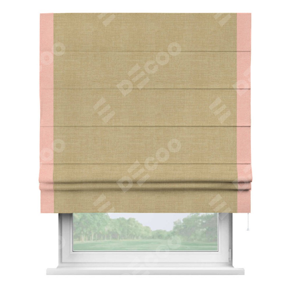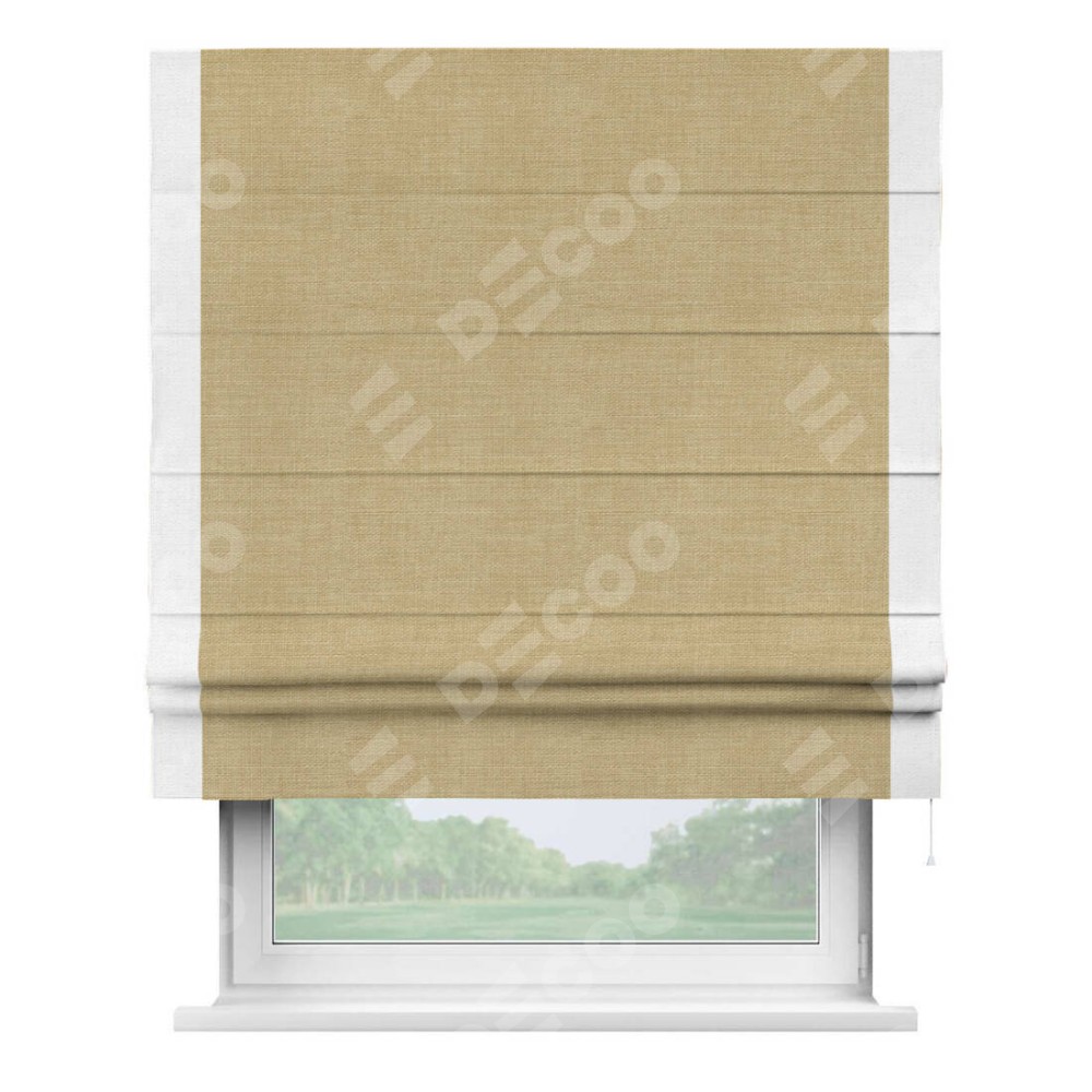 Римская штора производителя «Cortin», используется для проёма, пошита из ткани лён бежевый, артикул 7442. Отделка шторы кантом «Стрим Дуо», ткань для канта используется из льна разной расцветки на выбор. Имеет универсальный механизм и подходит для монтажа: на потолок, на стену и в нишу.