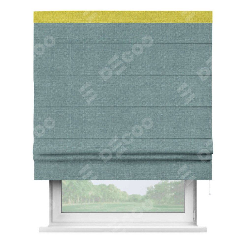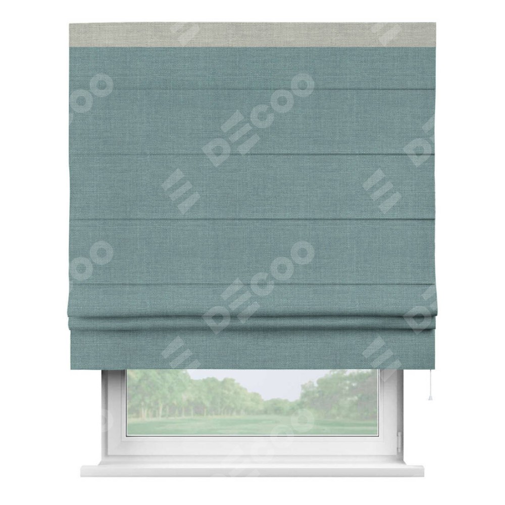 Римская штора производителя «Cortin», используется для проёма, пошита из ткани лён голубой, артикул 74 736. Отделка шторы кантом «Кинг», ткань для канта используется из льна разной расцветки на выбор. Имеет универсальный механизм и подходит для монтажа: на потолок, на стену и в нишу.
