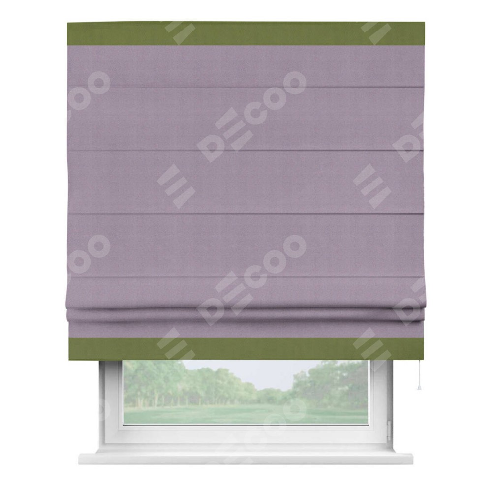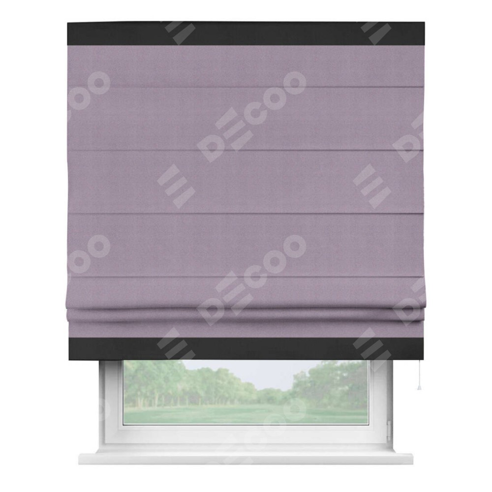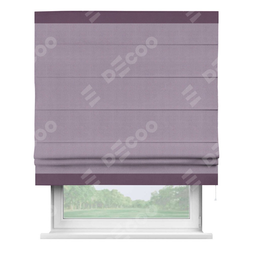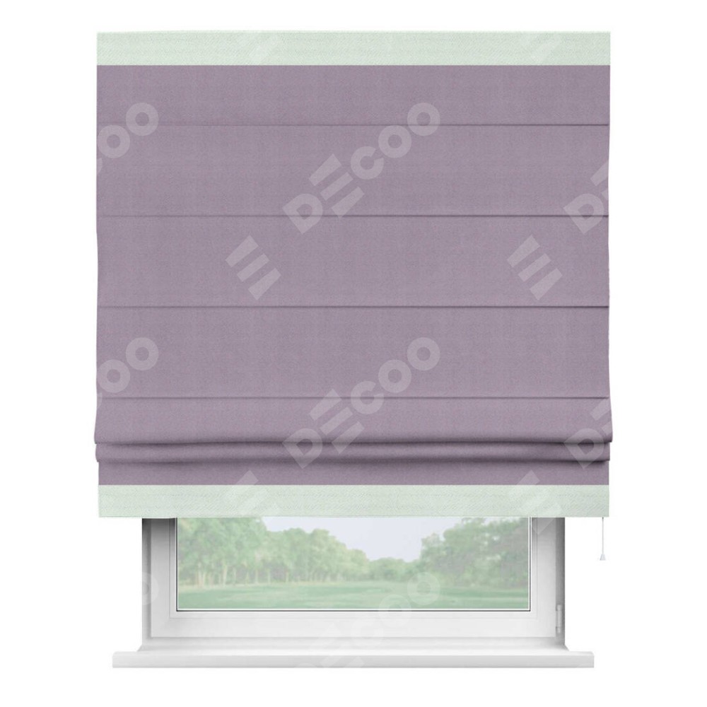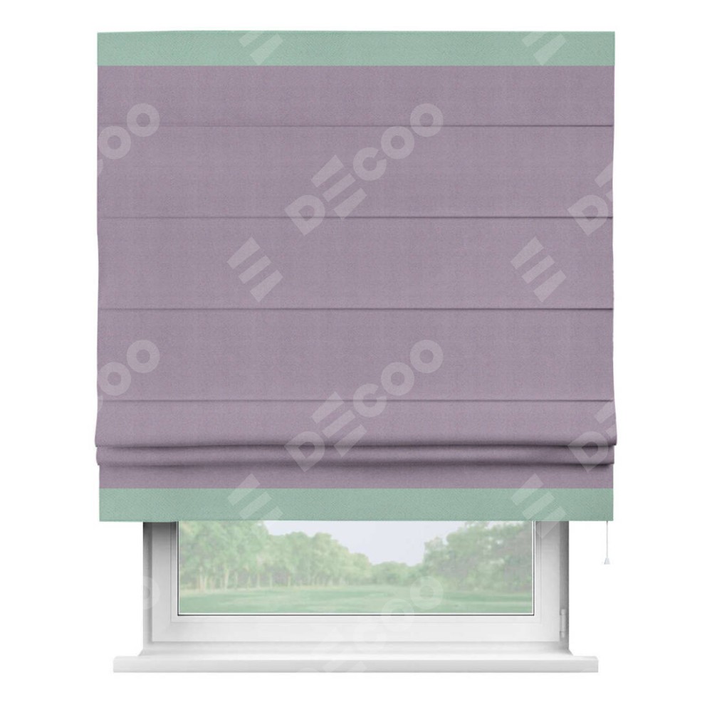 Римская штора производителя «Cortin», используется для проёма, пошита из ткани блэкаут однотонный светло-сиреневый, артикул ткани 29333−1. Отделка шторы кантом «Горизонт», ткань для канта используется из блэкаута однотонного разной расцветки на выбор. Имеет универсальный механизм и подходит для монтажа: на потолок, на стену и в нишу.