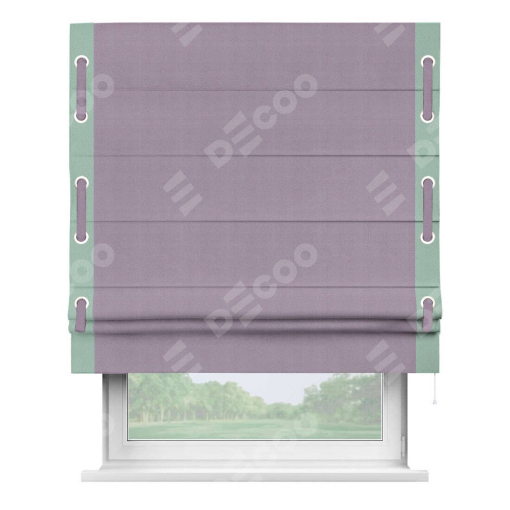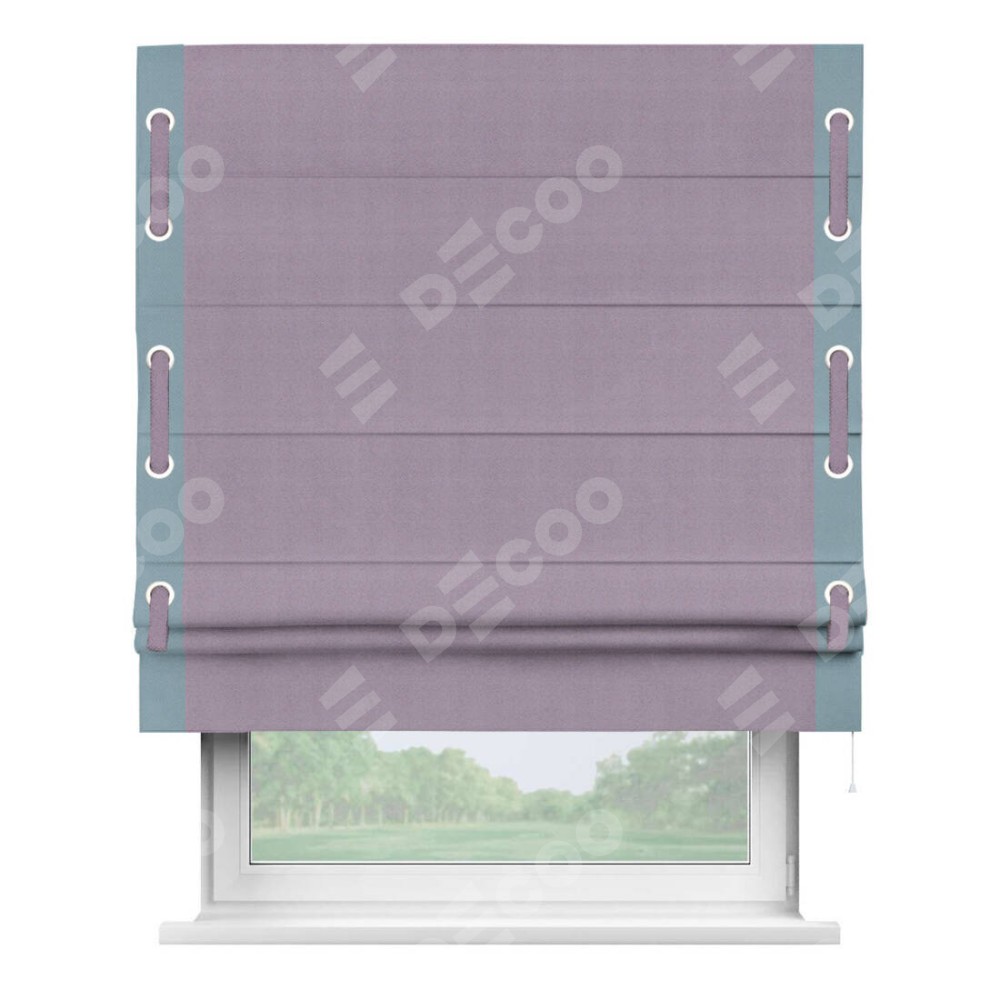 Римская штора производителя «Cortin», используется для проёма, пошита из ткани блэкаут однотонный светло-сиреневый, артикул ткани 29333−1. Отделка шторы кантом «Стрим Дуо» на кантах расположены люверсы с пояском, ткань для канта используется из блэкаута однотонного разной расцветки на выбор. Ткань для пояска обычно используется из основной ткани шторы, а так же можно сделать из любой расцветки по желанию. Имеет универсальный механизм и подходит для монтажа: на потолок, на стену и в нишу.