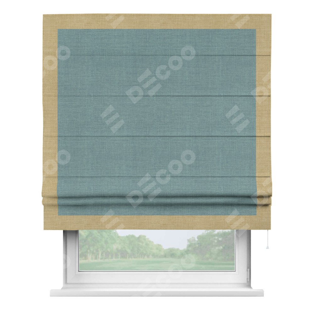 Римская штора производителя «Cortin», используется для проёма, пошита из ткани лён голубой, артикул 74736. Отделка шторы кантом «Чесс», ткань для канта используется из льна разной расцветки на выбор. Имеет универсальный механизм и подходит для монтажа: на потолок, на стену и в нишу.
