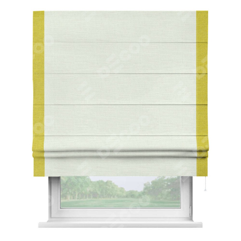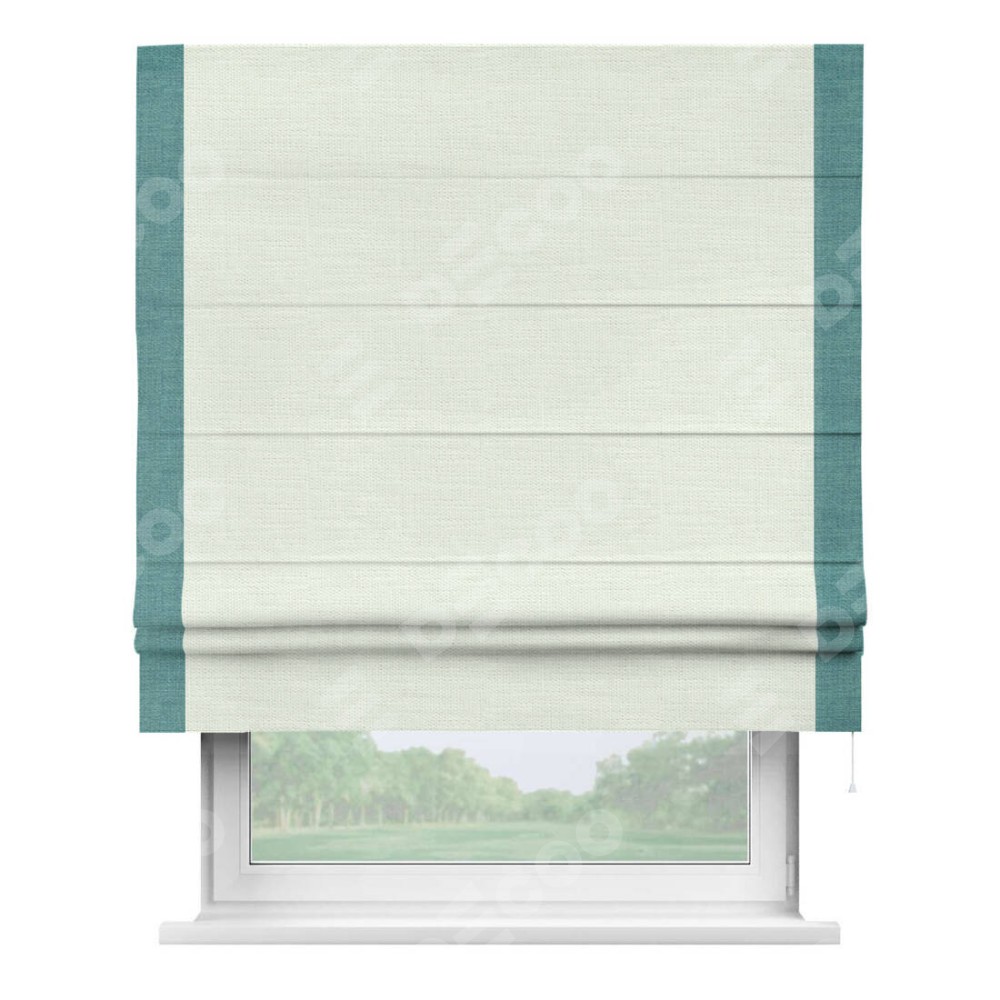 Римская штора производителя «Cortin», используется для проёма, пошита из ткани лён молочный, артикул 23568. Отделка шторы кантом «Стрим Дуо», ткань для канта используется из льна разной расцветки на выбор. Имеет универсальный механизм и подходит для монтажа: на потолок, на стену и в нишу.