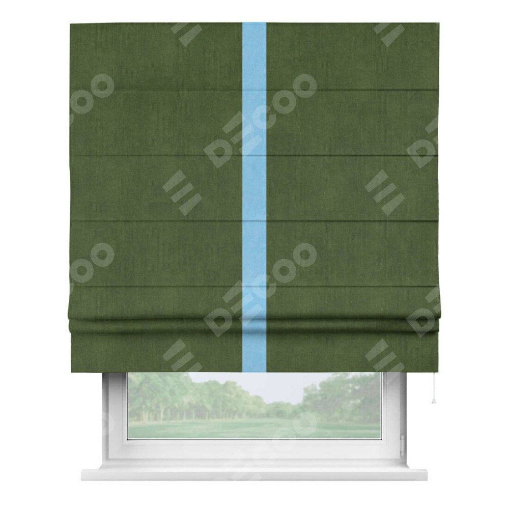 Римская штора производителя «Cortin», используется для проёма, пошита из ткани вельвет тёмно-салатовый, артикул ткани 33805. Отделка шторы кантом «Хайвей», ткань для канта используется из вельвета разной расцветки на выбор. Имеет универсальный механизм и подходит для монтажа: на потолок, на стену и в нишу.