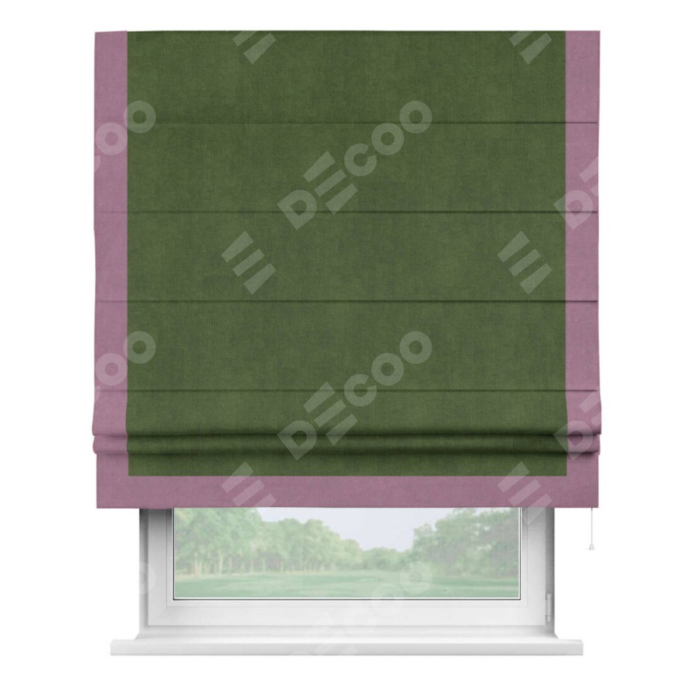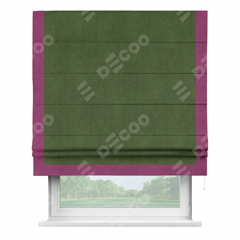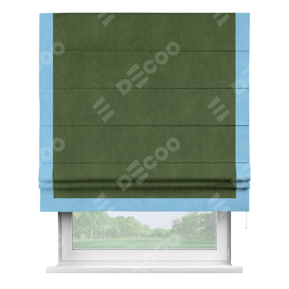 Римская штора производителя «Cortin», используется для проёма, пошита из ткани вельвет тёмно-салатовый, артикул ткани 33805. Отделка шторы кантом «Виктория», ткань для канта используется из вельвета разной расцветки на выбор. Имеет универсальный механизм и подходит для монтажа: на потолок, на стену и в нишу.