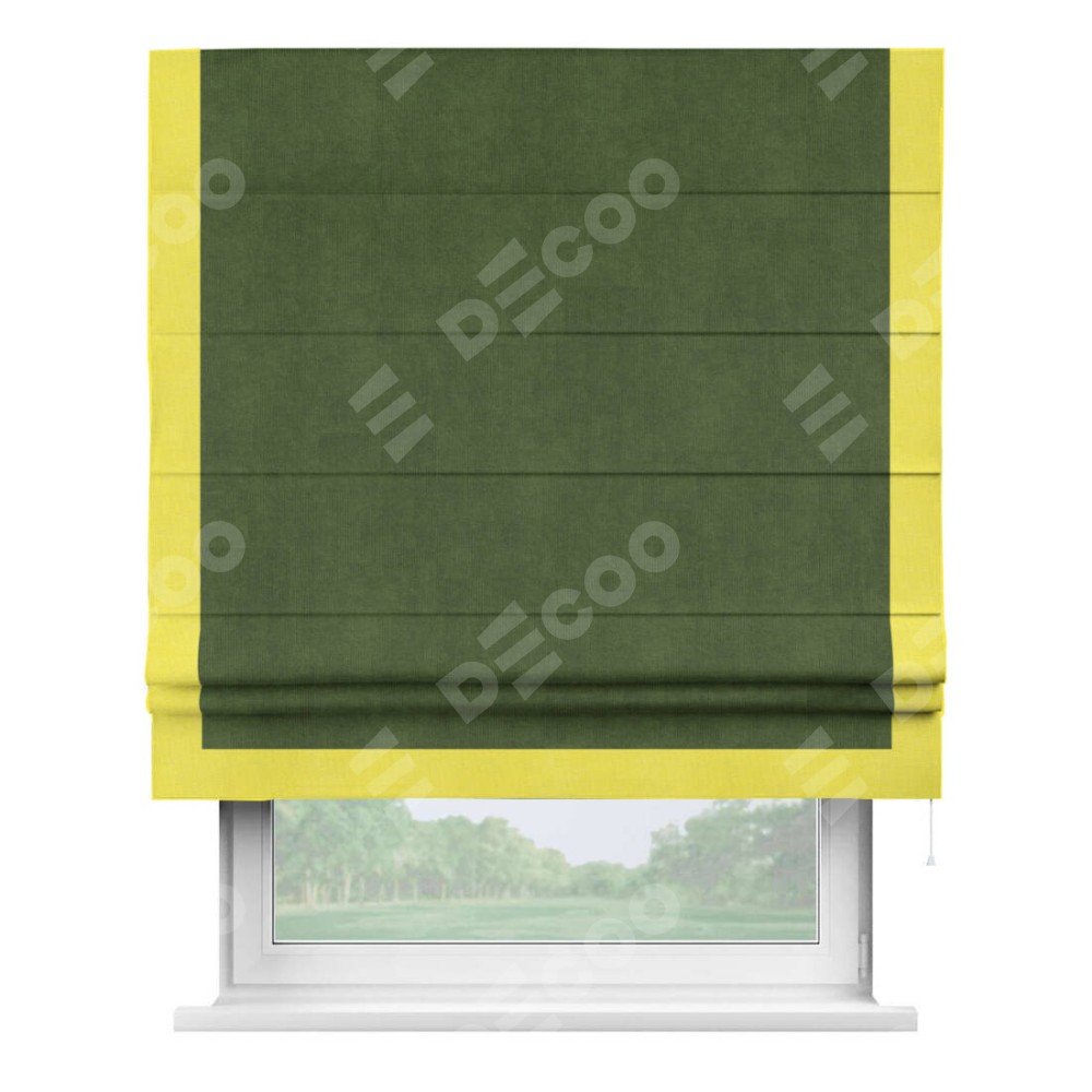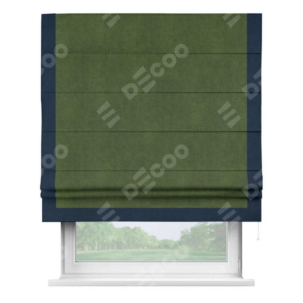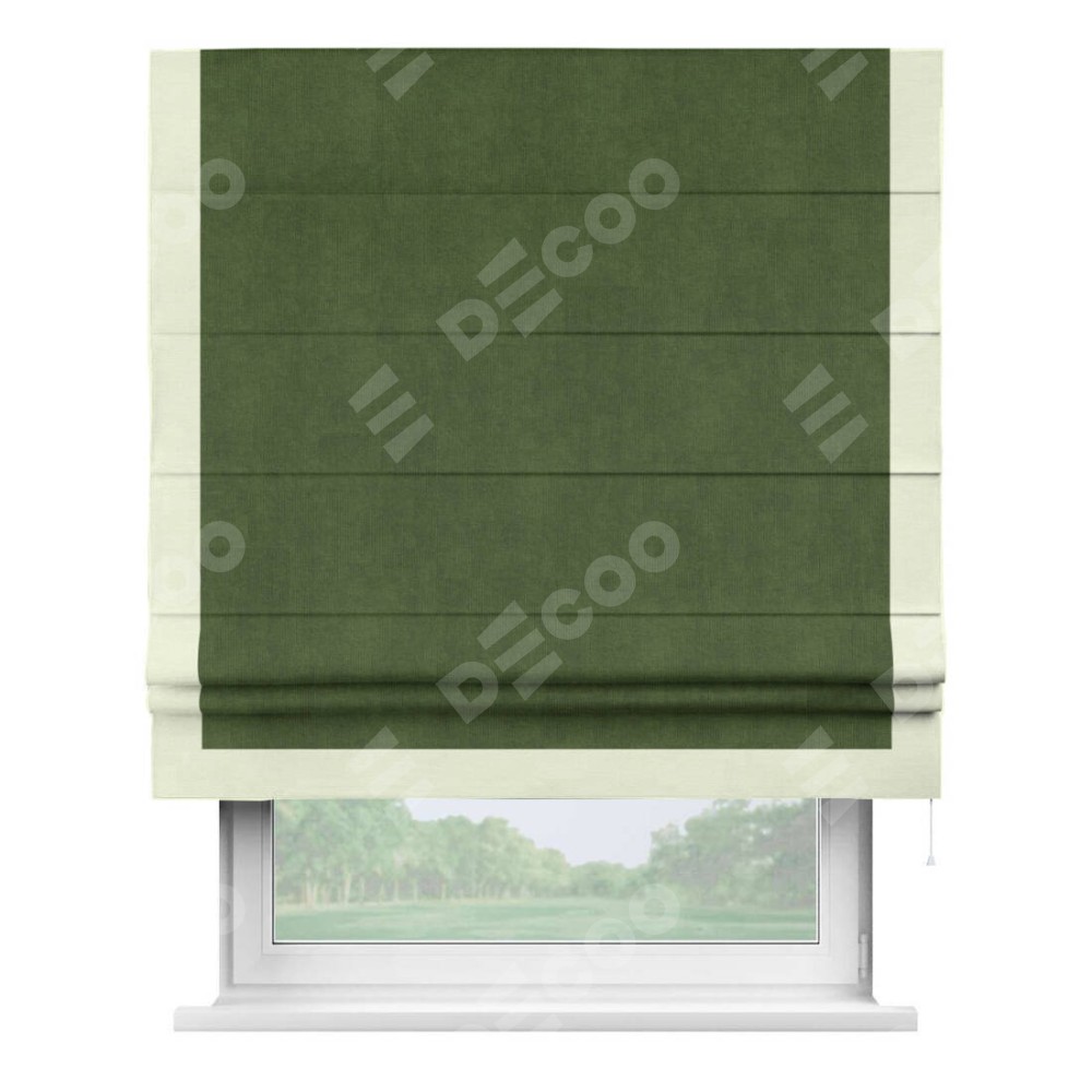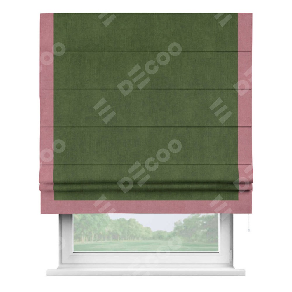 Римская штора производителя «Cortin», используется для проёма, пошита из ткани вельвет тёмно-салатовый, артикул ткани 33805. Отделка шторы кантом «Виктория», ткань для канта используется из вельвета разной расцветки на выбор. Имеет универсальный механизм и подходит для монтажа: на потолок, на стену и в нишу.