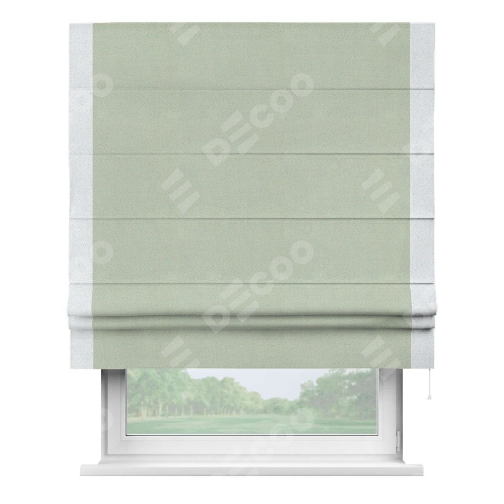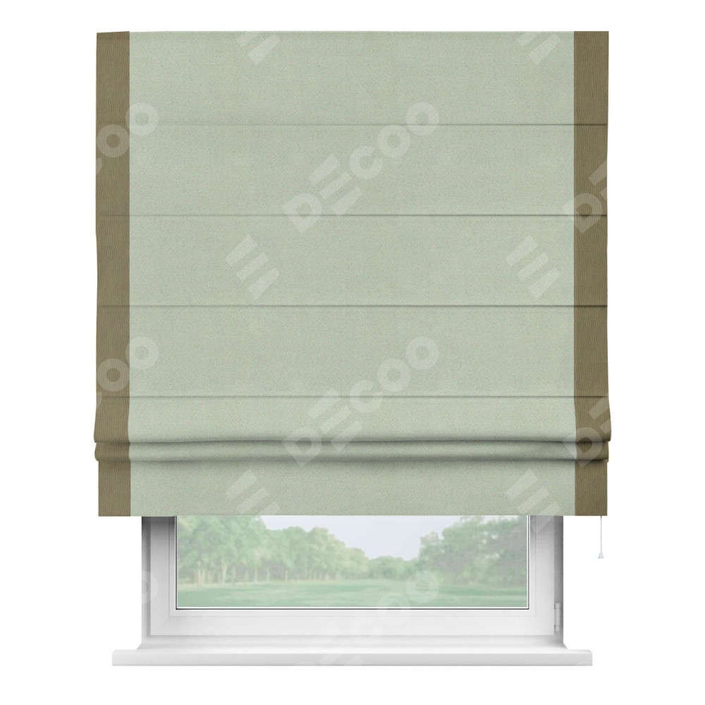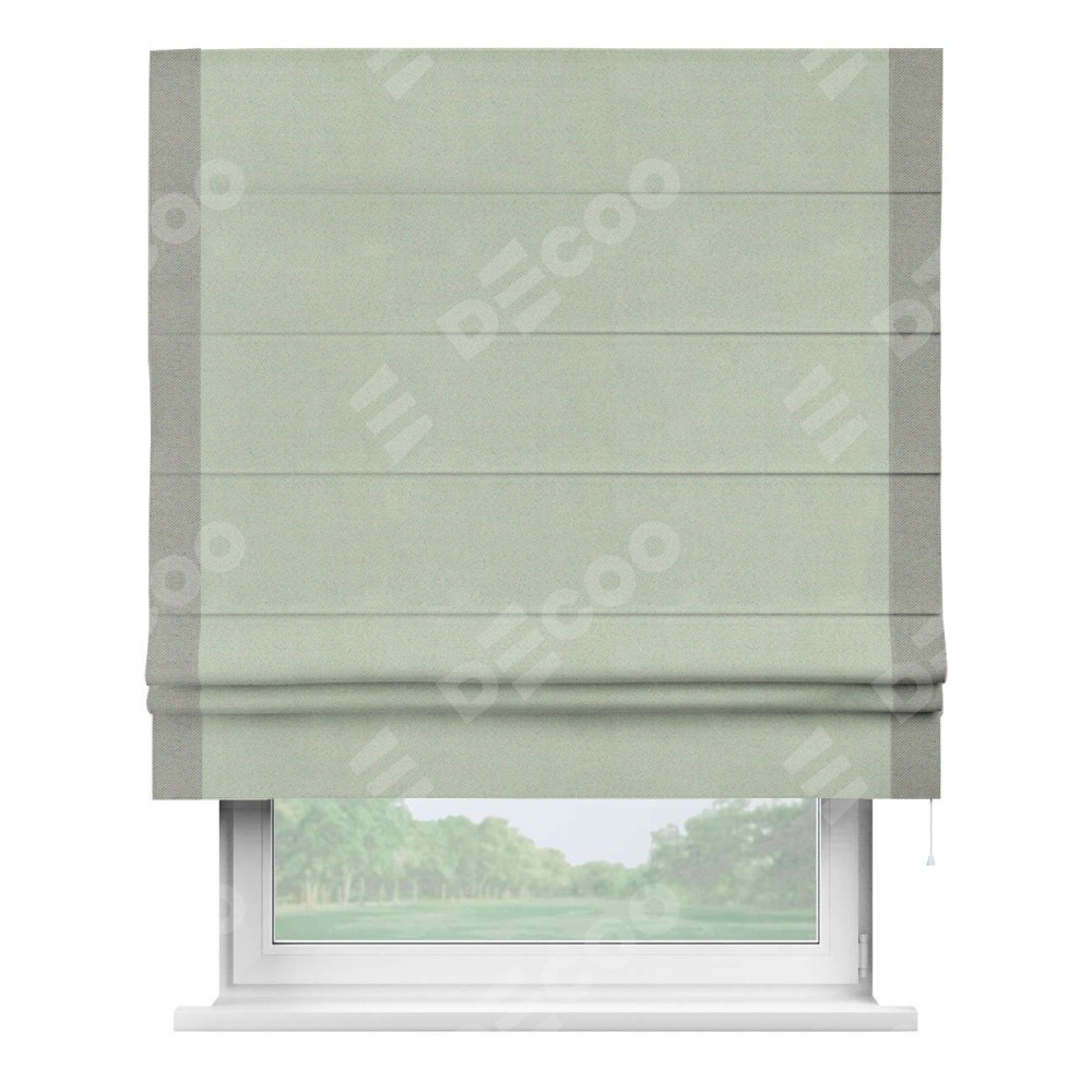 Римская штора производителя «Cortin», используется для проёма, пошита из ткани блэкаут однотонный светло-серый, артикул ткани 29332−2. Отделка шторы кантом «Стрим Дуо», ткань для канта используется из блэкаута однотонного разной расцветки на выбор. Имеет универсальный механизм и подходит для монтажа: на потолок, на стену и в нишу.