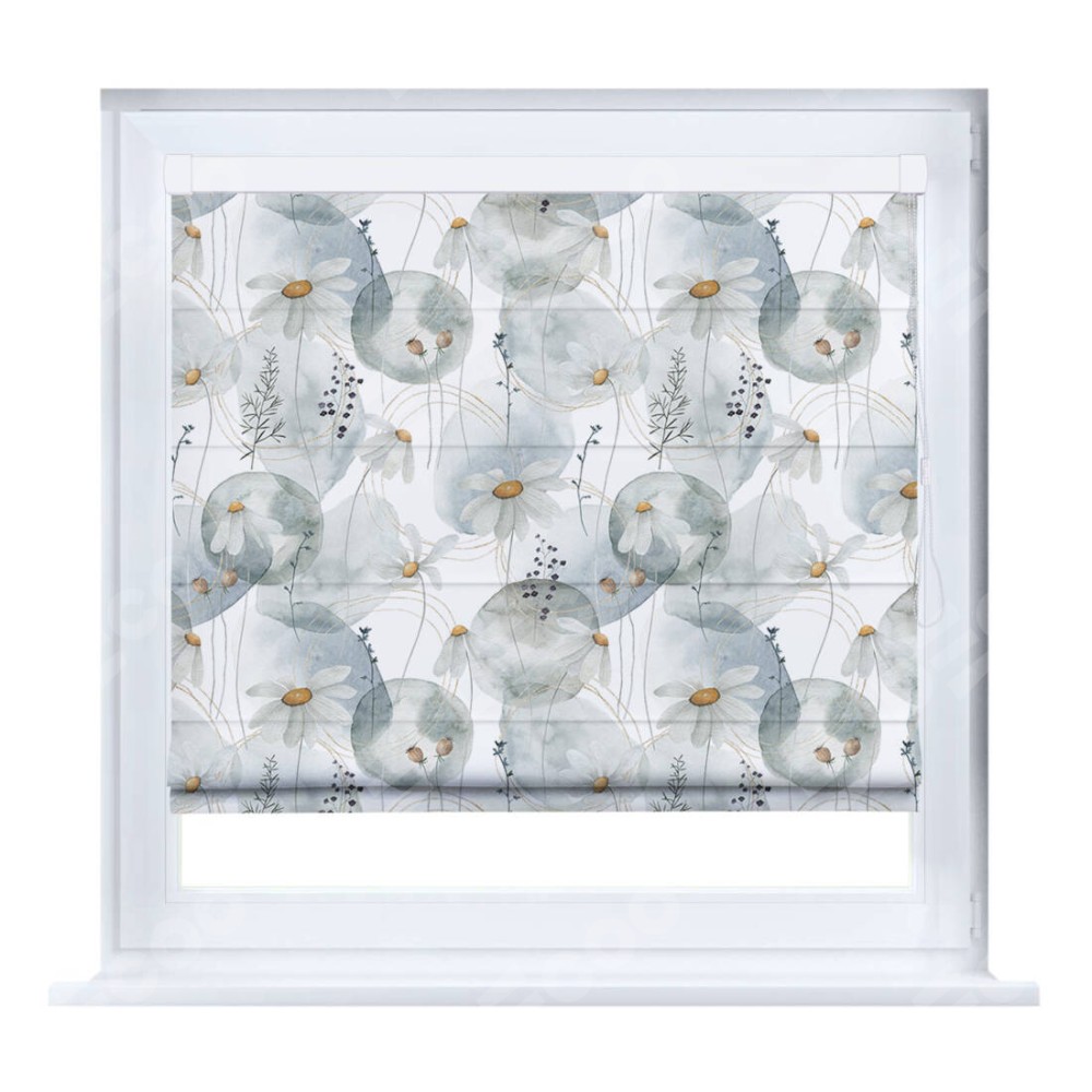 Римская штора производителя «Cortin», устанавливается на створку окна, пошита из ткани блэкаут с нанесением сублимационной печати «Ромашки акварель». Штора шьётся по индивидуальным размерам, для данного типа римской шторы возможная ширина от 35 до 150 см., высота до 250 см.