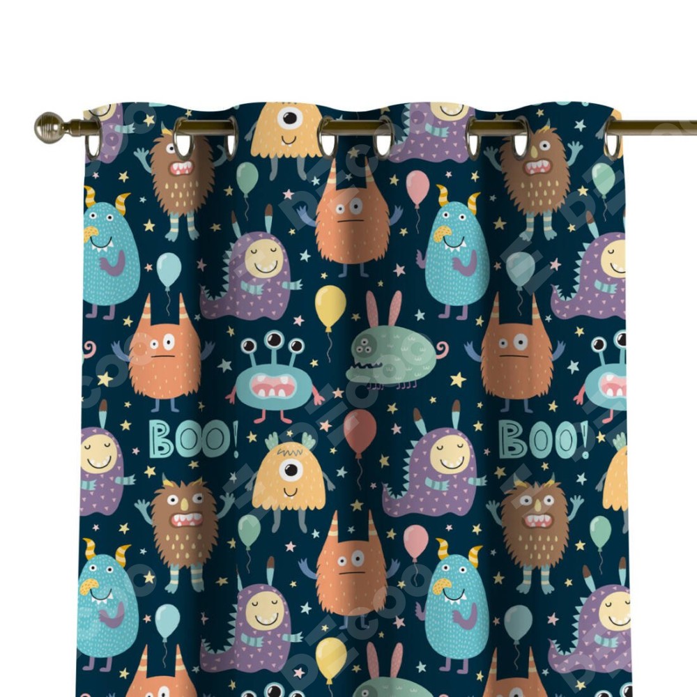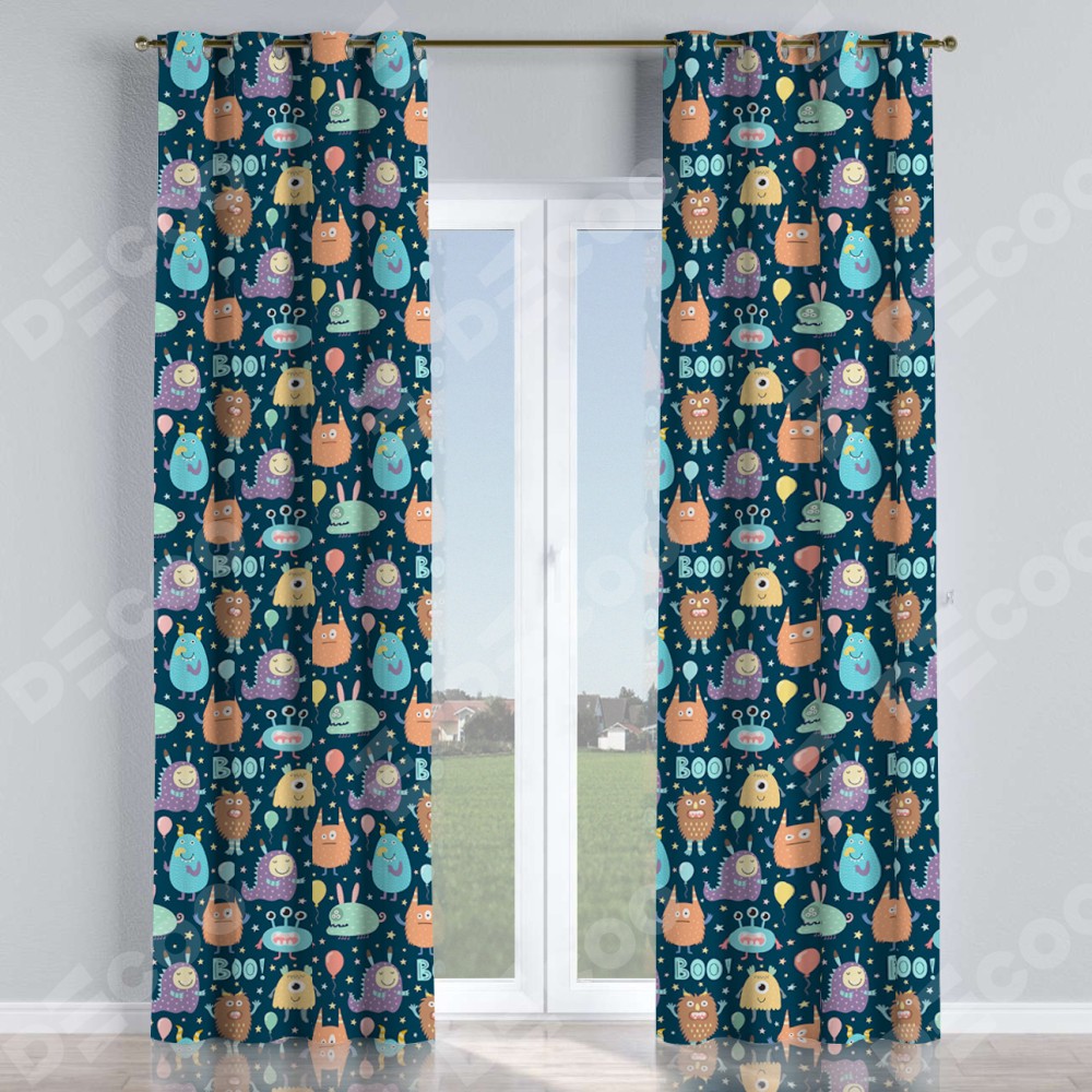 Комплект прямых штор, от производителя «Cortin», пошиты из ткани блэкаут с нанесением сублимационной печати «Звёздные страшилки». Данная модель пошита на люверсах, комплектуется на выбор круглым карнизом и подходит для монтажа на стену или потолок. Прямые шторы на люверсах шьются по стандарту с коэффициентом 1/2 (на 100 см. ширины проёма 200 см. ширины ткани), отличительным преимуществом данной модели является простой способ монтажа. Достаточно повесить ее на трубу и штора готова!
