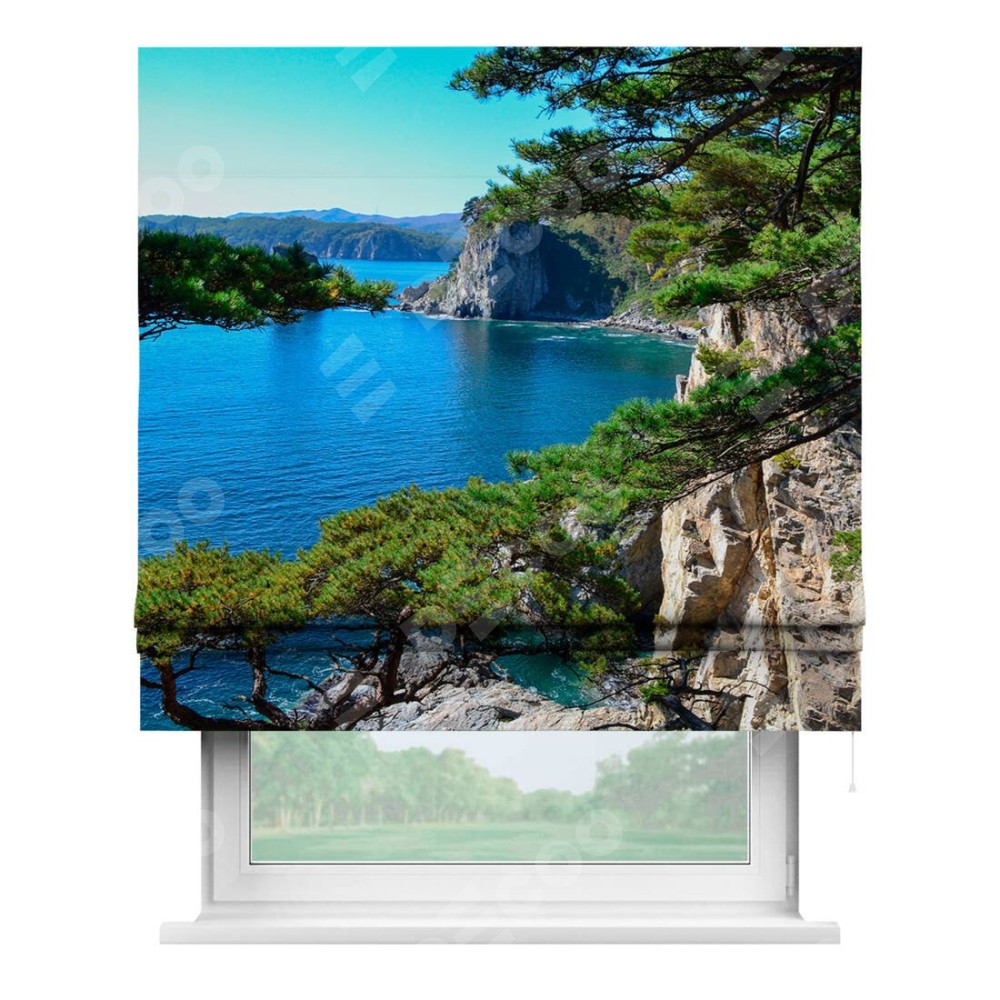 Римская штора «Кортин» для проема «Море и сосны» предоставлена в следующих характеристиках: