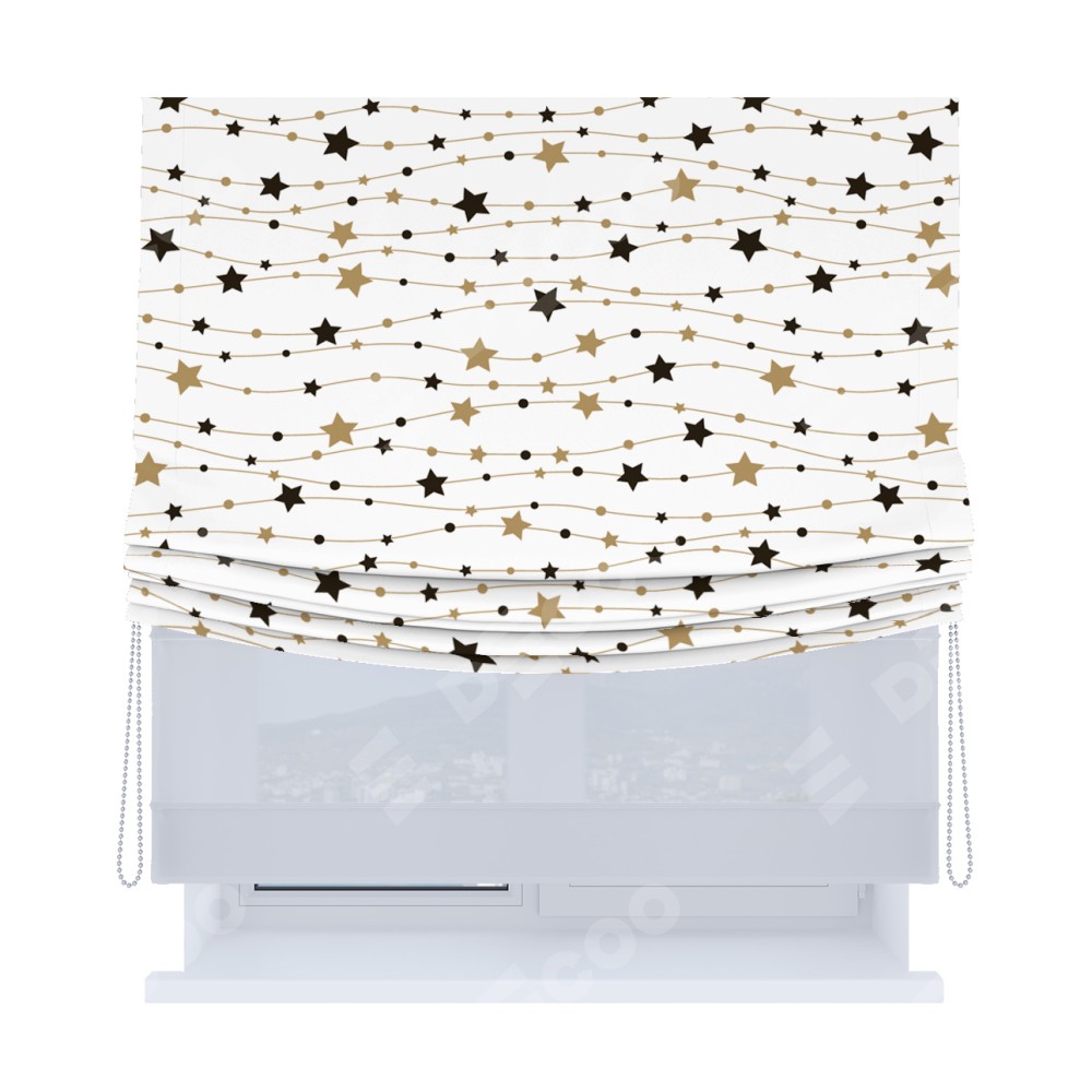 Римская штора день-ночь производителя «Cortin», используется для проёма, пошита из двух полотен, с лицевой блэкаут с нанесением сублимационной печати «Звёздная нить», вторая ткань тюль (по стандарту комплектуется тюль белого цвета артикул V-01). Имеет универсальный механизм и подходит для монтажа: на потолок, на стену и в нишу. Удобное управление каждой шторой отдельно.
