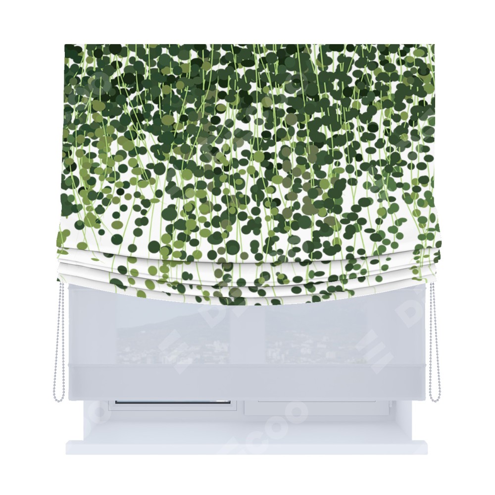 Римская штора день-ночь производителя «Cortin», используется для проёма, пошита из двух полотен, с лицевой блэкаут с нанесением сублимационной печати «Зелёный занавес», вторая ткань тюль (по стандарту комплектуется тюль белого цвета артикул V-01). Имеет универсальный механизм и подходит для монтажа: на потолок, на стену и в нишу. Удобное управление каждой шторой отдельно.