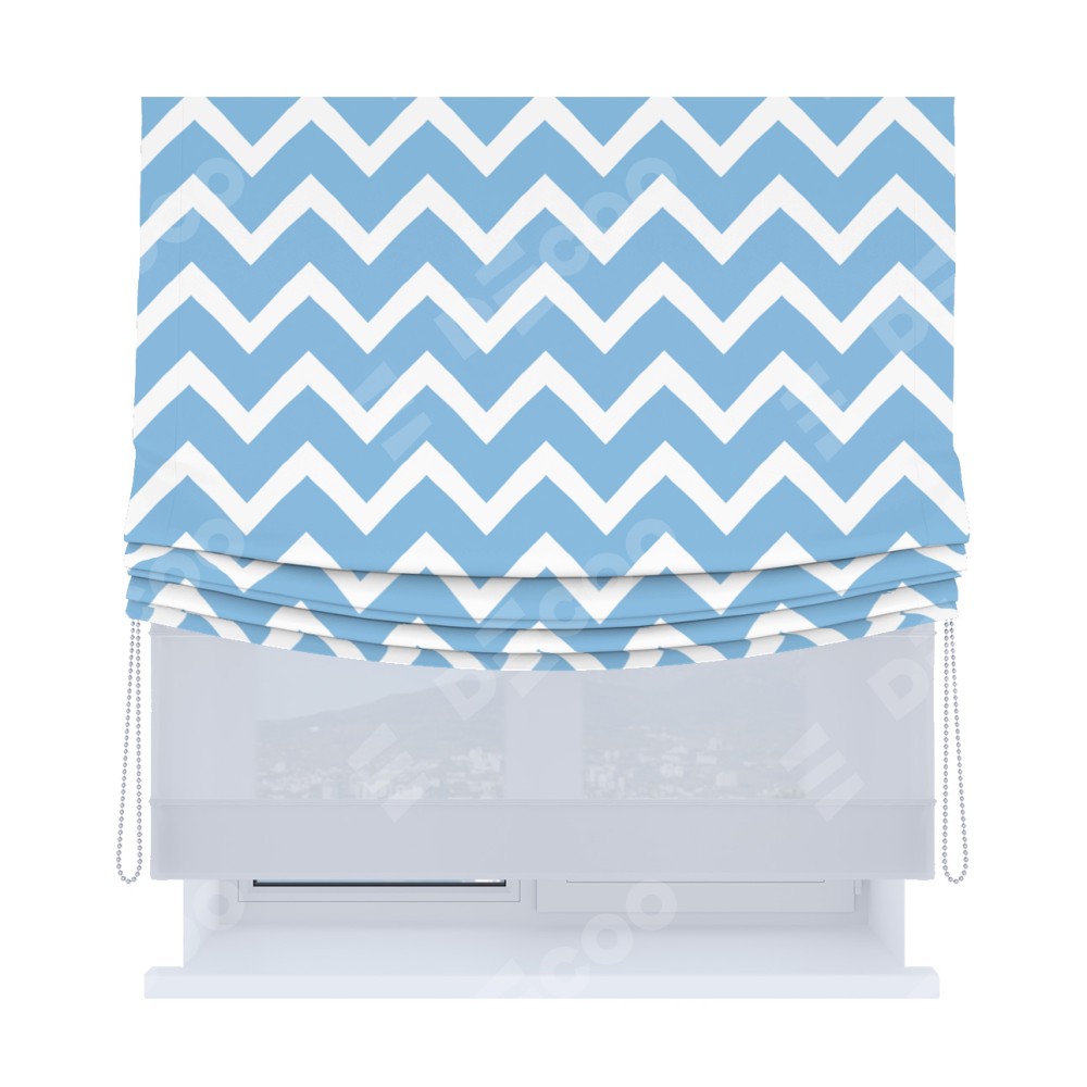 Римская штора день-ночь производителя «Cortin», используется для проёма, пошита из двух полотен, с лицевой блэкаут с нанесением сублимационной печати «Зигзаг средний», вторая ткань тюль (по стандарту комплектуется тюль белого цвета артикул V-01). Имеет универсальный механизм и подходит для монтажа: на потолок, на стену и в нишу. Удобное управление каждой шторой отдельно.