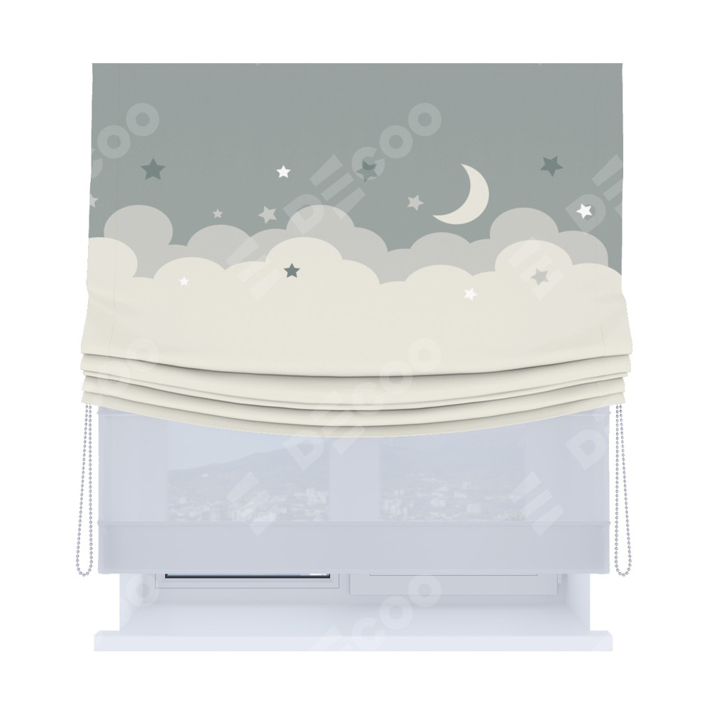 Римская штора день-ночь производителя «Cortin», используется для проёма, пошита из двух полотен, с лицевой блэкаут с нанесением сублимационной печати «Ночные облака», вторая ткань тюль (по стандарту комплектуется тюль белого цвета артикул V-01). Имеет универсальный механизм и подходит для монтажа: на потолок, на стену и в нишу. Удобное управление каждой шторой отдельно.