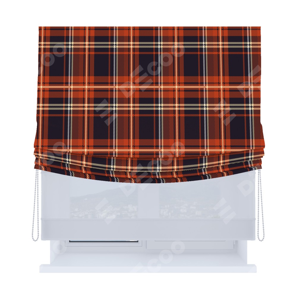 Римская штора день-ночь производителя «Cortin», используется для проёма, пошита из двух полотен, с лицевой блэкаут с нанесением сублимационной печати «Сине-оранжевая клетка», вторая ткань тюль (по стандарту комплектуется тюль белого цвета артикул V-01). Имеет универсальный механизм и подходит для монтажа: на потолок, на стену и в нишу. Удобное управление каждой шторой отдельно.