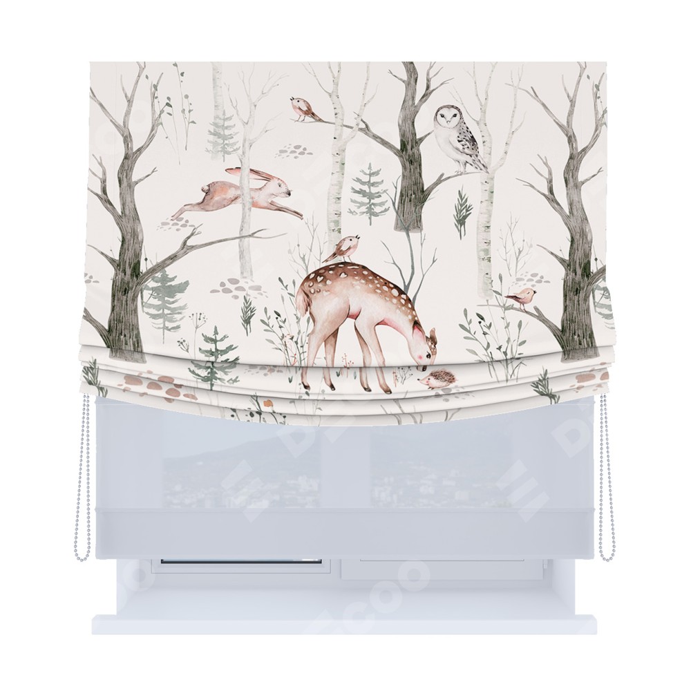 Римская штора день-ночь производителя «Cortin», используется для проёма, пошита из двух полотен, с лицевой блэкаут с нанесением сублимационной печати «Скандинавский питомник», вторая ткань тюль (по стандарту комплектуется тюль белого цвета артикул V-01). Имеет универсальный механизм и подходит для монтажа: на потолок, на стену и в нишу. Удобное управление каждой шторой отдельно.
