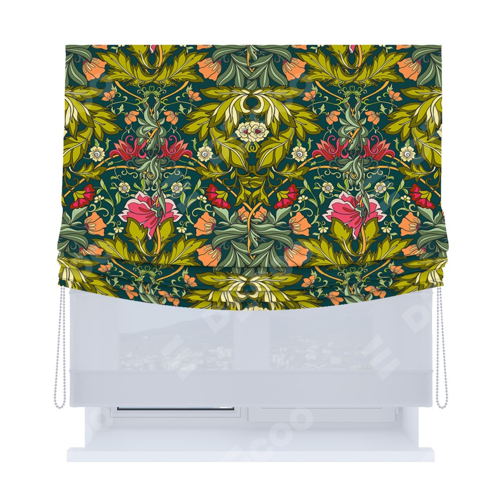 Римская штора день-ночь производителя «Cortin», используется для проёма, пошита из двух полотен, с лицевой блэкаут с нанесением сублимационной печати «Цветок морриса», вторая ткань тюль (по стандарту комплектуется тюль белого цвета артикул V-01). Имеет универсальный механизм и подходит для монтажа: на потолок, на стену и в нишу. Удобное управление каждой шторой отдельно.