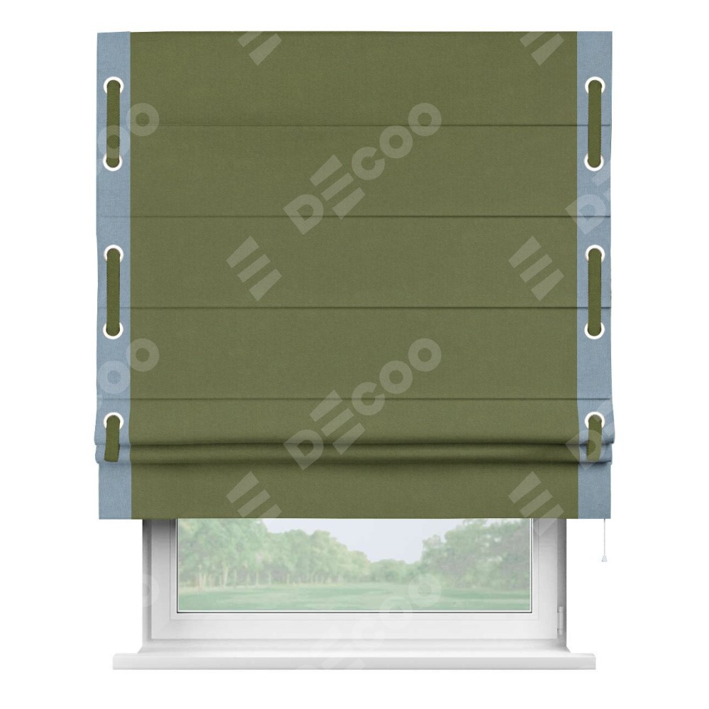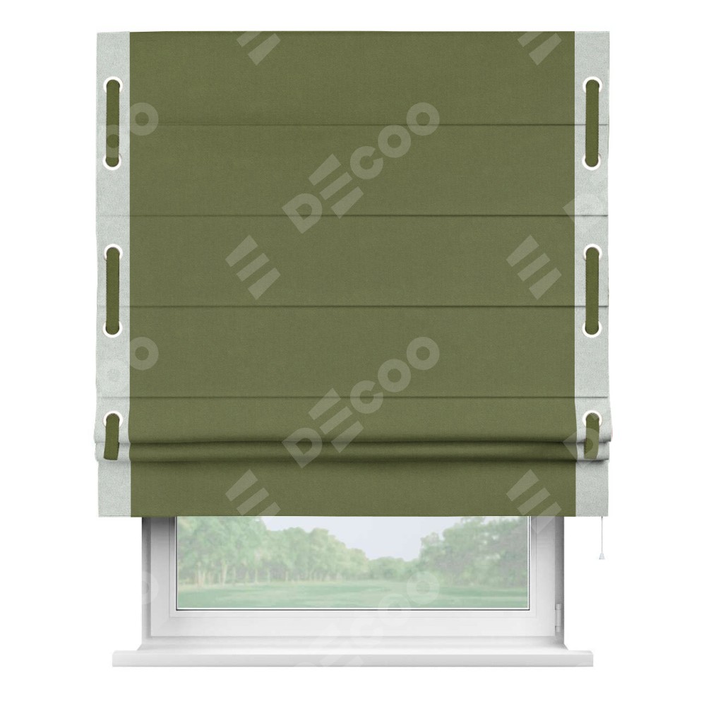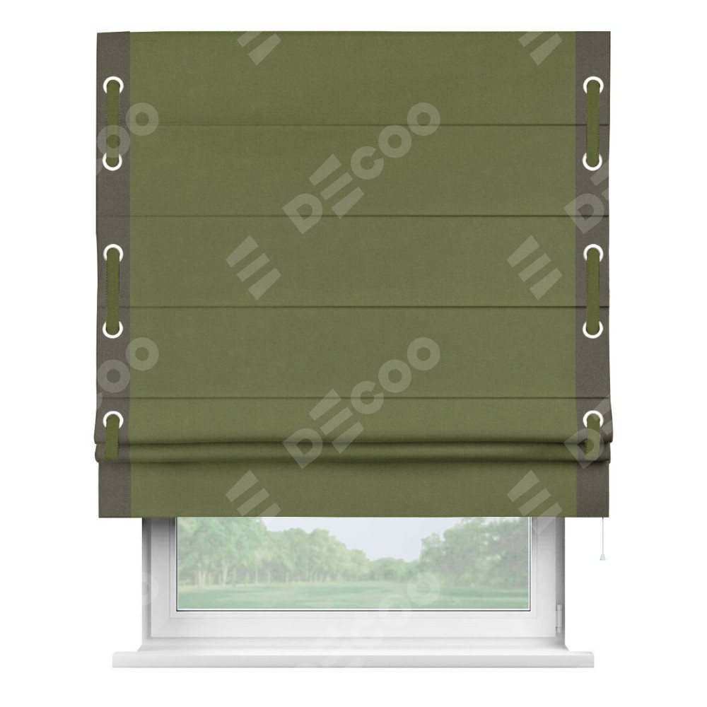 Римская штора производителя «Cortin», используется для проёма, пошита из ткани лён блэкаут оливковый, артикул 69516. Отделка шторы кантом «Стрим Дуо» на кантах расположены люверсы с пояском, ткань для канта используется из льна разной расцветки на выбор. Ткань для пояска обычно используется из основной ткани шторы, а так же можно сделать из любой расцветки по желанию. Имеет универсальный механизм и подходит для монтажа: на потолок, на стену и в нишу.