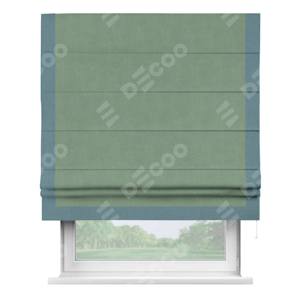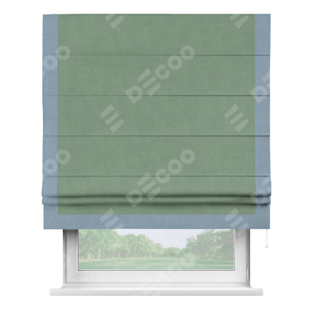 Римская штора производителя «Cortin», используется для проёма, пошита из ткани лён блэкаут светло-бирюзовый, артикул 69443. Отделка шторы кантом «Виктория», ткань для канта используется из льна разной расцветки на выбор. Имеет универсальный механизм и подходит для монтажа: на потолок, на стену и в нишу.