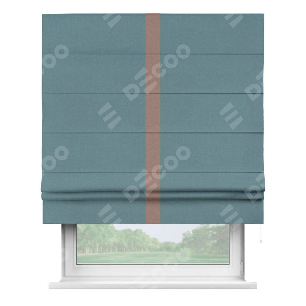 Римская штора производителя «Cortin», используется для проёма, пошита из ткани лён блэкаут синий, артикул 69528. Отделка шторы кантом «Хайвэй», ткань для канта используется из льна разной расцветки на выбор. Имеет универсальный механизм и подходит для монтажа: на потолок, на стену и в нишу.