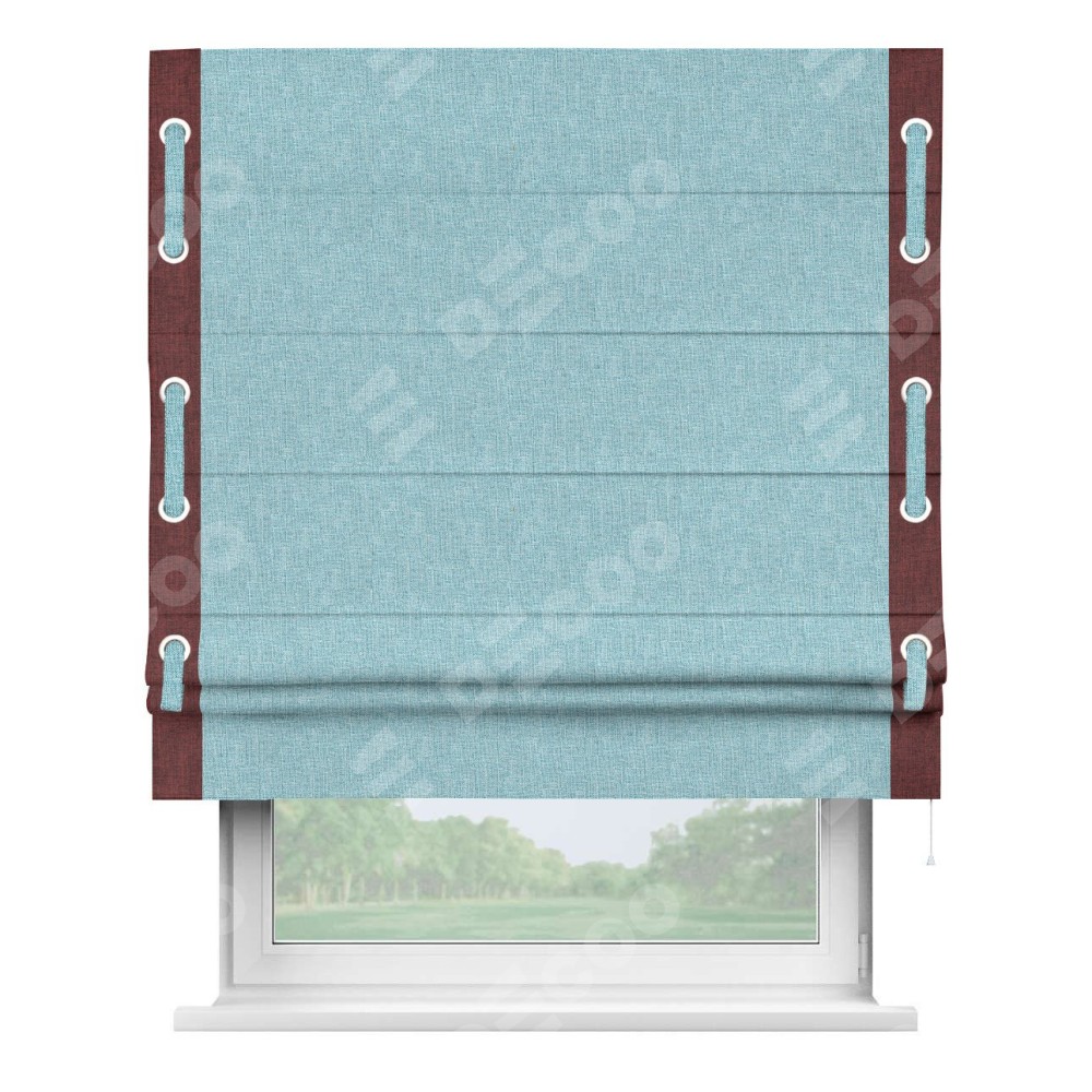 Римская штора производителя «Cortin», используется для проёма, пошита из ткани лён кашемир голубой, артикул 21616. Отделка шторы кантом «Стрим Дуо» на кантах расположены люверсы с пояском, ткань для канта используется из льна разной расцветки на выбор. Ткань для пояска обычно используется из основной ткани шторы, а так же можно сделать из любой расцветки по желанию. Имеет универсальный механизм и подходит для монтажа: на потолок, на стену и в нишу.