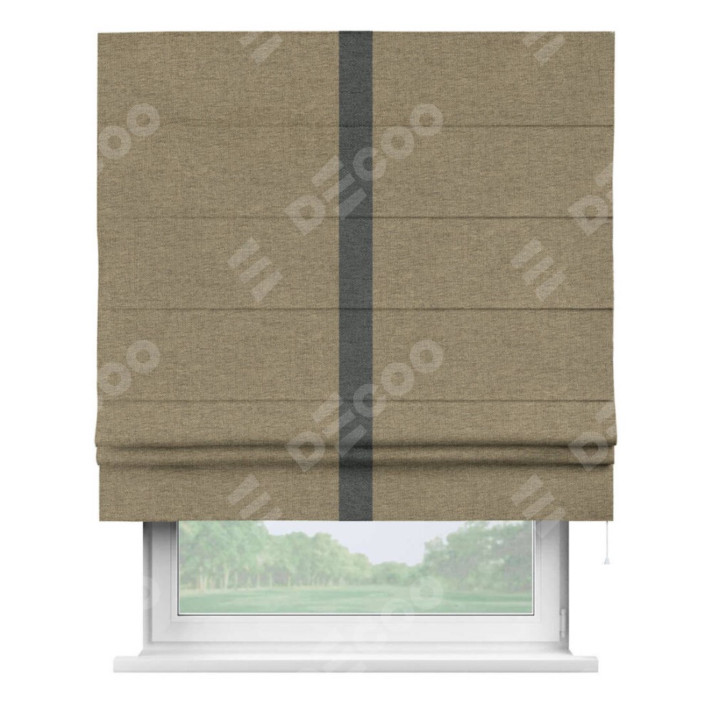 Римская штора производителя «Cortin», используется для проёма, пошита из ткани стиф димаут тёмно-бежевый, артикул 18085. Отделка шторы кантом «Хайвэй», ткань для канта используется из стифа разной расцветки на выбор. Имеет универсальный механизм и подходит для монтажа: на потолок, на стену и в нишу.